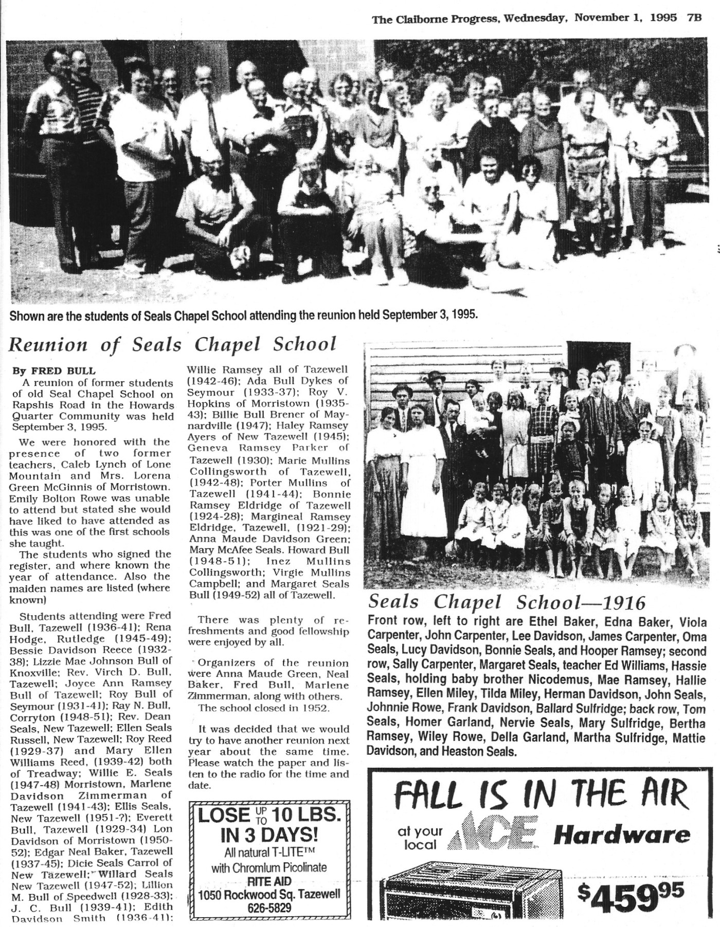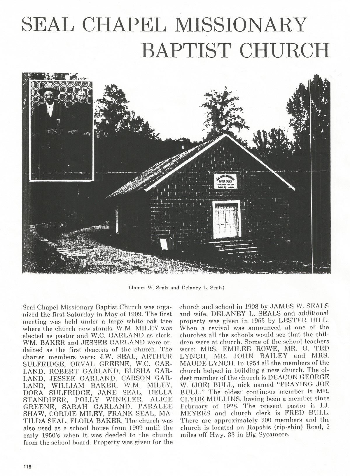 According to a book written in 1986, "All Our Churches of Claiborne County, Tennessee," James W. and Delaney Seals donated property for a church and school to be built on Rapshis Road in Big Sycamore. Seal Chapel Missionary Baptist Church was organized in May 1909. The church also served as a school from 1909 until the early 1950s. Here's a picture of the students from 1916. This photo appeared in the Claiborne Progress in 1995 to celebrate the reunion of former students that year. Many Seals and Sulfridge family members appear in the photo, including Margaret Jane Seals, daughter of James W. and Laney Seals, who was around age 15 when the photo was taken. See the article for the names of all the students. Margaret Jane Seals is in the second row, second from the left. See The Seals Family Homestead in Tennessee for more on the Seals home and the chapel's structural evolution through the years. It's clear from the 1916 photo that the chapel originally had wood siding. The wood structure was replaced with brick, both with and without the front covered porch. Finally, in recent years the brick construction was replaced with cement block with a covered porch across the entire front and wheelchair access.