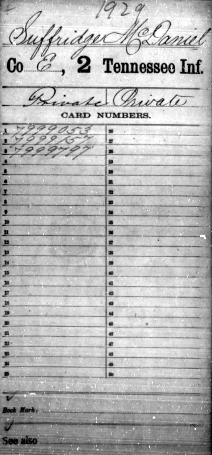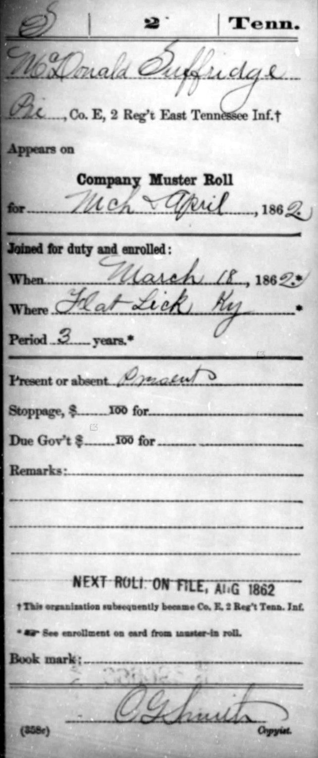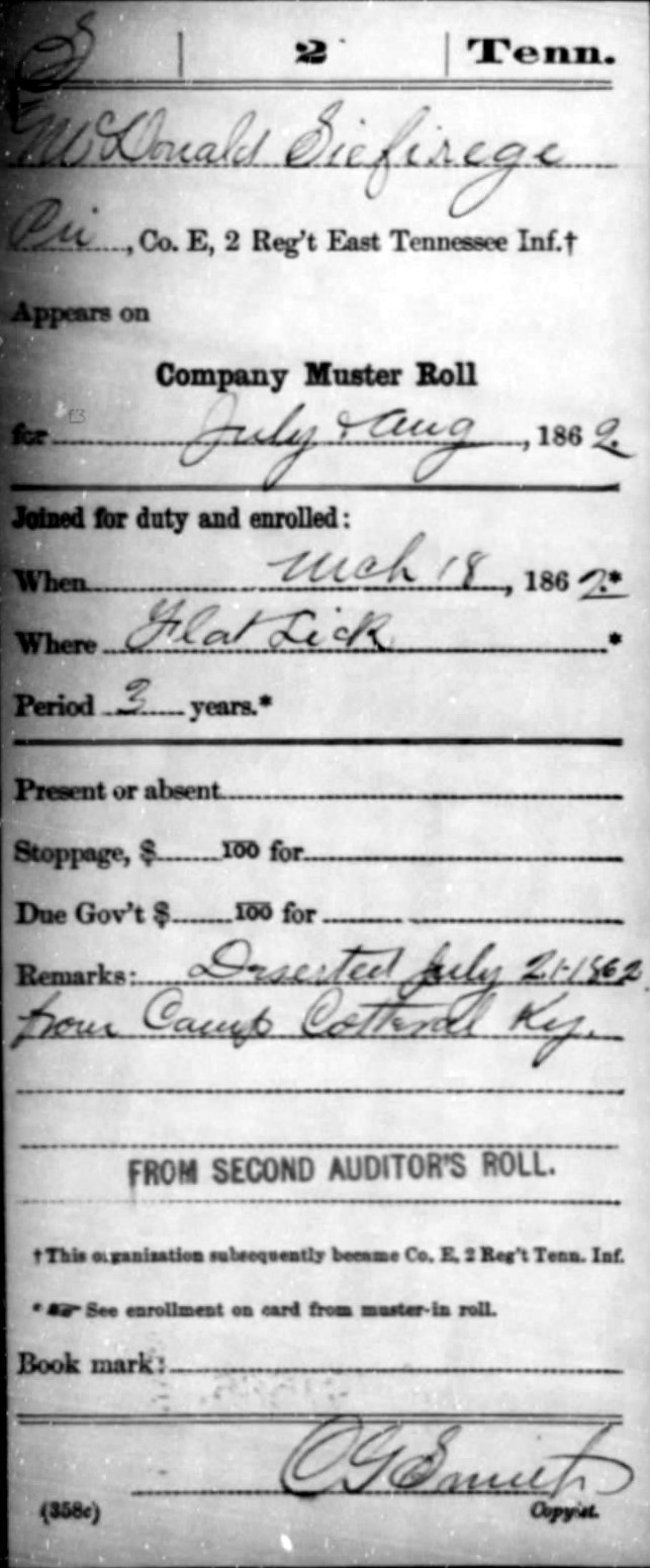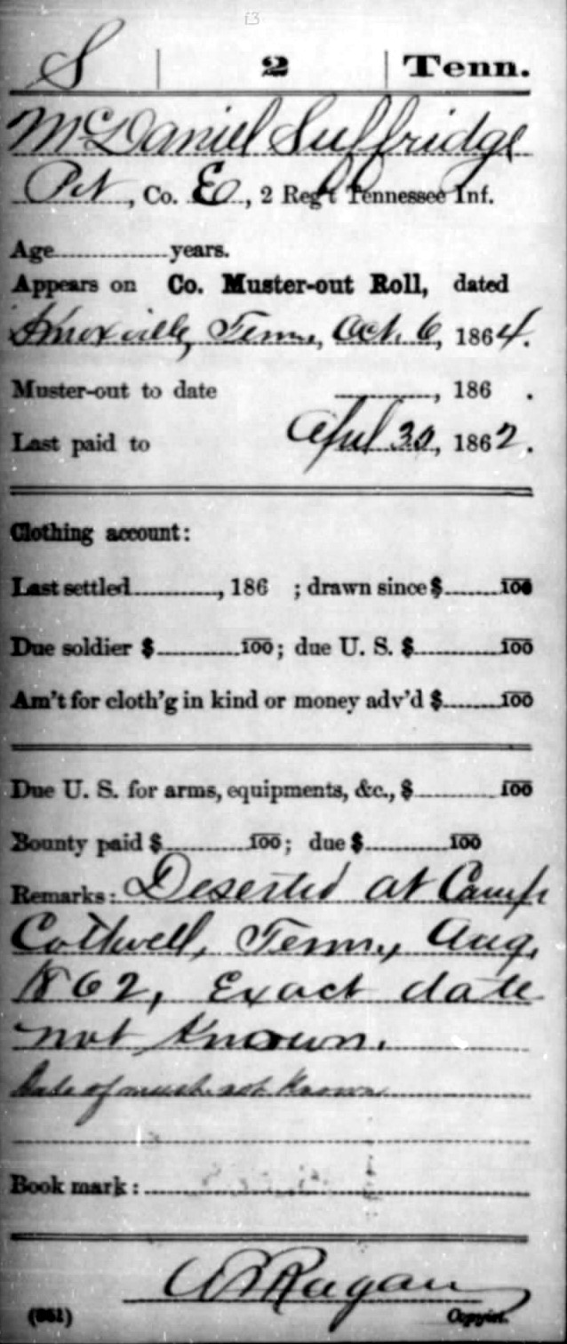 - his Civil War Service Record which variously indicated his name was McDaniel Suffridge (twice), McDonald Suffridge, and McDonald Siefirege. Like so many East Tennesseans, McDaniel Sulfridge's record indicates he "deserted" at one point during his service. As indicated in Seals, Part 3, with the ebb and flow of the front lines during the war, many East Tennesseans had to make difficult choices when Union troops drew back from the Tennessee border. Often, soldiers chose to go home to protect their families, rather than leave them at the mercy of Confederate troops and sympathizers who often terrorized families that they believed supported the Union. These same troops usually went back to their units or joined others after spending time with their families to ensure their safety. The last document indicates that he mustered out of his regiment on Oct. 6, 1864 in Knoxville, Tenn.