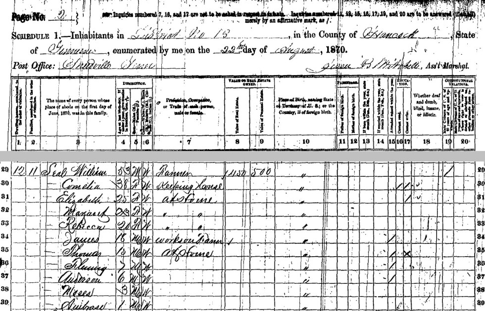 The 1870 census showed the following children living in the William and Cordelia (Mays) Seal household. The enumerator wrote Cordelia's name as Cornelia. He listed a child named Fleming living in the house. This was likely William B. Seal, Jr. who was born in 1862. Alton Lee Greene has indicated that William's nickname was Flim and the name Fleming would have come from Cordelia's father, Fleming Mays. The enumerator indicated that Elizabeth could read, but could not write.