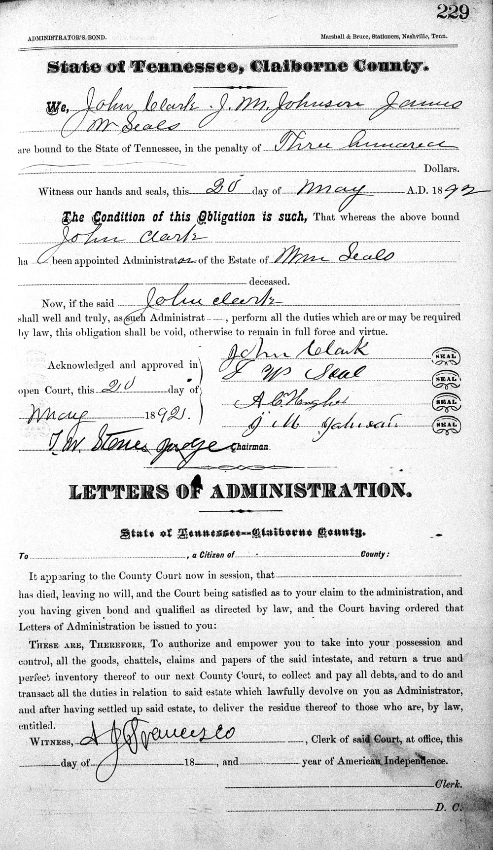 William Seales appears in the 1880 census with his wife Deala (Cordelia). On May 20, 1892, John Clark was appointed administrator of the estate of Wm. Seals by the Clerk of the Court in Claiborne Co., Tenn. James W. Seals was also held liable for the administrator's bond. It's presumed that William Seal died shortly before this date. William Seal is buried at Howard Quarter Cemetery in Claiborne Co., Tenn. There does not appear to be a date of death on his tombstone.