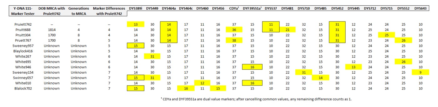 The thirteen testers listed in the above chart took the FTDNA 111-marker Y-DNA test. All thirteen testers had identical values for 93 of the 111 markers. Listed above are the 18 markers that had a difference in one or more testers. Using this author (Pruiett742) as the baseline, we can determine the number of marker differences between him and each of the testers. Those differences, called Genetic Distance by FTDNA, are a crude way to identify how many generations there are between two testers. For Pruitt688, the number of marker differences is 4 (DYS712 is not highlighted because it is one of the fastest mutating markers and, for this group, has such a wide variation in results). If we then look at the documented family trees of Pruiett742 and Pruitt688, we see that they are in fact separated by four generations to their most recent common ancestor (MRCA) who happens to be Thomas Stuart Pruitt, born in 1814. For Pruitt304 and Pruett767, the marker differences with Pruiett742 are 4 and 5 respectively. Based on their family trees compared to Pruiett742, they are actually separated by 8 generations, having Samuel Pruitt, born around 1700, as their MRCA. The results of this kind of analysis are not always perfect, but the trend is usually pretty clear. All the Whites, Sweeneys/Swinneys and the Blaylocks are 5 to 7 generations removed from Pruiett742 according to their Y-DNA tests, suggesting that they may share a MRCA born around 1700 or a generation or two before that. Since Samuel Pruitt's descendants are well documented in historical records, this analysis seems correct. It would be impossible to construct a theory that the common ancestor of these thirteen testers was born after Samuel Pruitt.