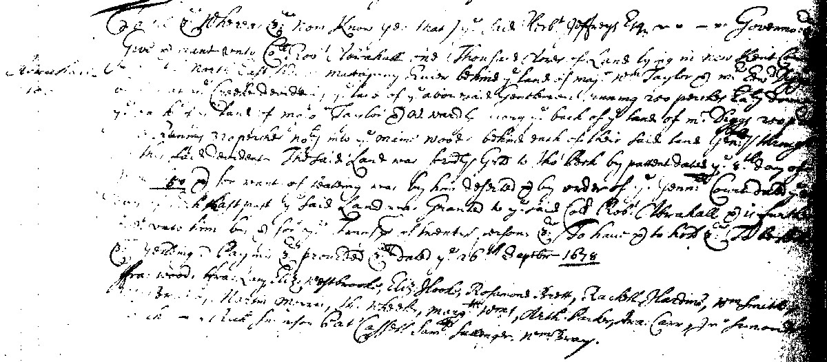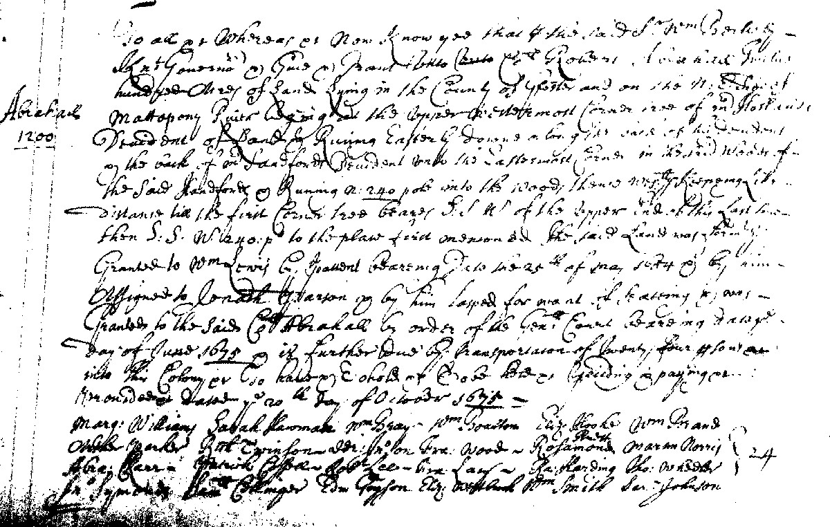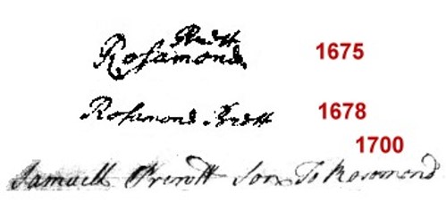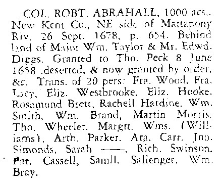 Twenty-five years before this birth record, on October 20, 1675, a Rosamond Pruett (or Brett) was claimed as a headright (along with 24 other individuals) on a grant of 1200 acres in Gloucester Co., Va. to Col. Robert Abrahall. Three years later, on September 26, 1678, Rosamond Brett was (again?) claimed by Col. Abrahall as a headright (along with 19 other individuals) for an additional 1000 acres in New Kent Co., Va. Both properties were described as being on the "NE side of Mattopony Riv." Since New Kent and Gloucester were contiguous counties at this time, the properties were likely close to each other. The fact that Col. Abrahall claimed at least 19 of the same people for both of these land patents supports our belief that the two land-patent Rosamonds were the same person.