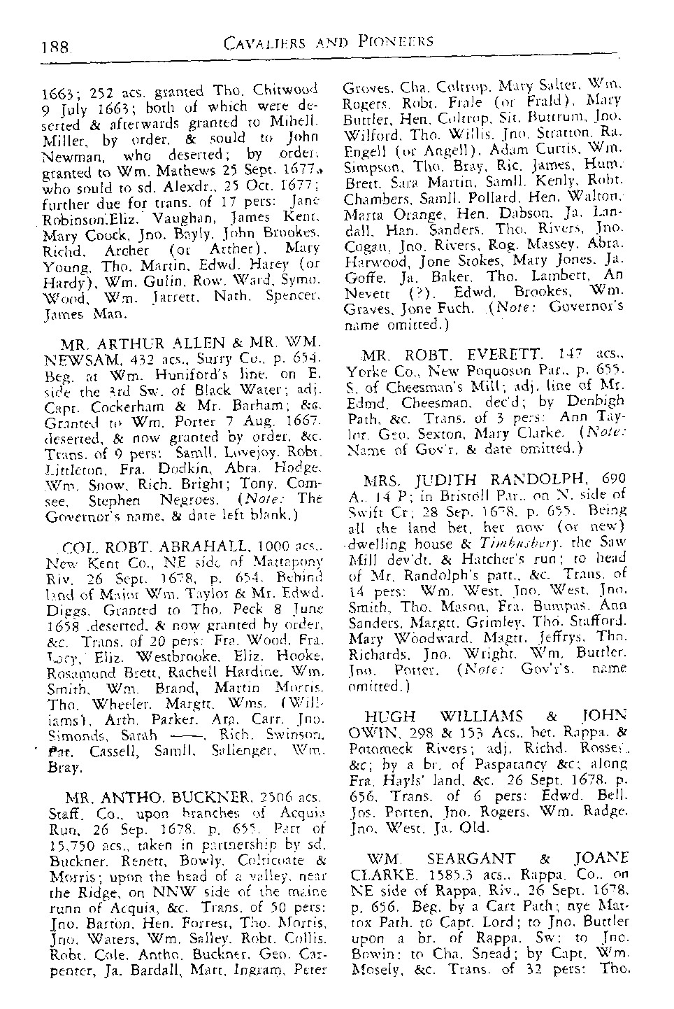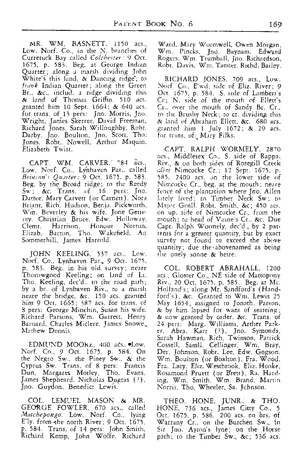 Each individual (or headright) entitled the patentee to 50 acres of land. It was common practice to buy and sell the names of potential headrights. The patentee need not have been responsible for paying the person's passage to America as long as he/she held the right to use their name. Each person's name should not have been used more than one time, but that requirement was often overlooked or ignored by patentees and the authorities who oversaw the process. In this case, since the land was patented in two different counties, the authorities may not have known that the colonel was using the same names.