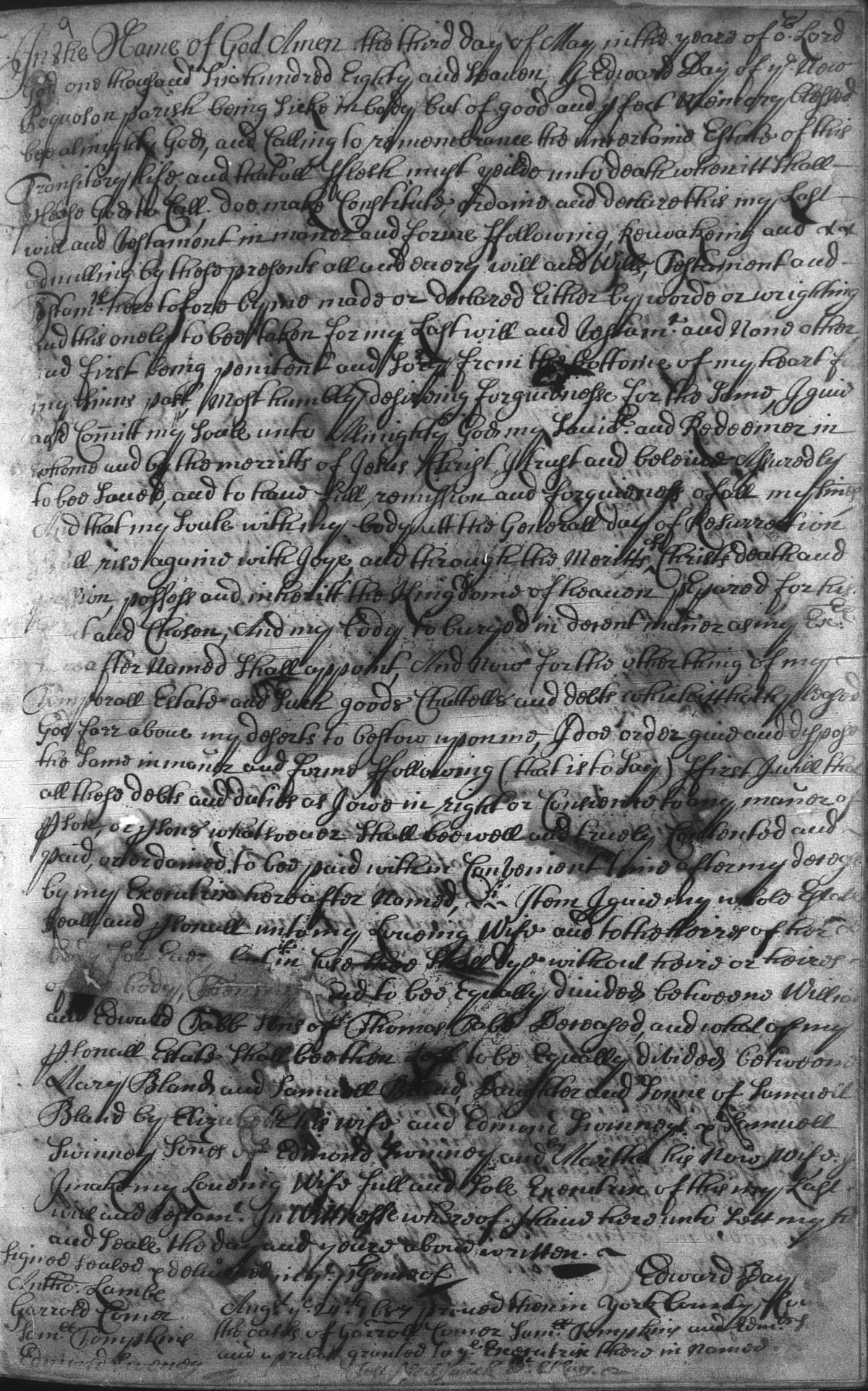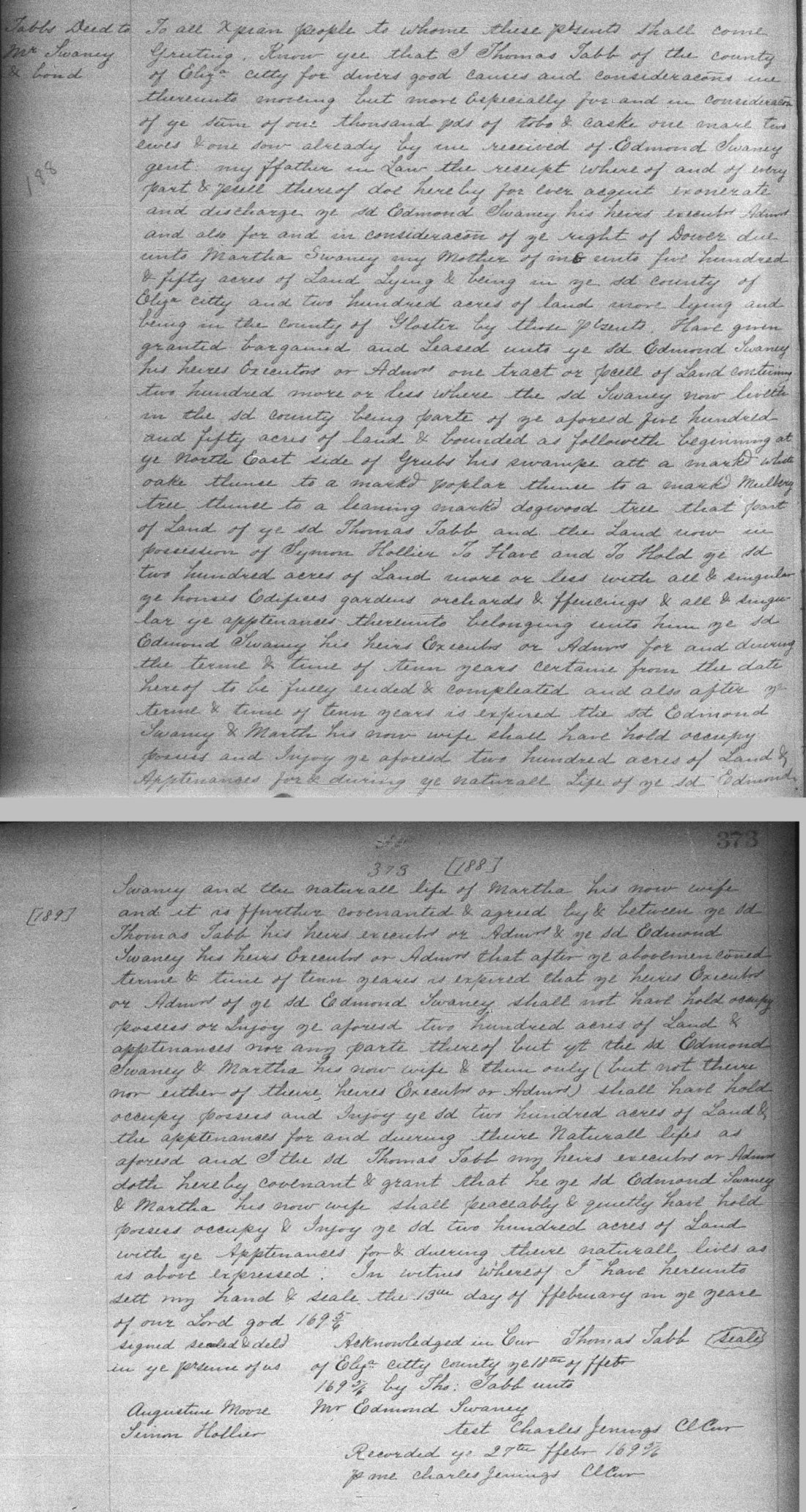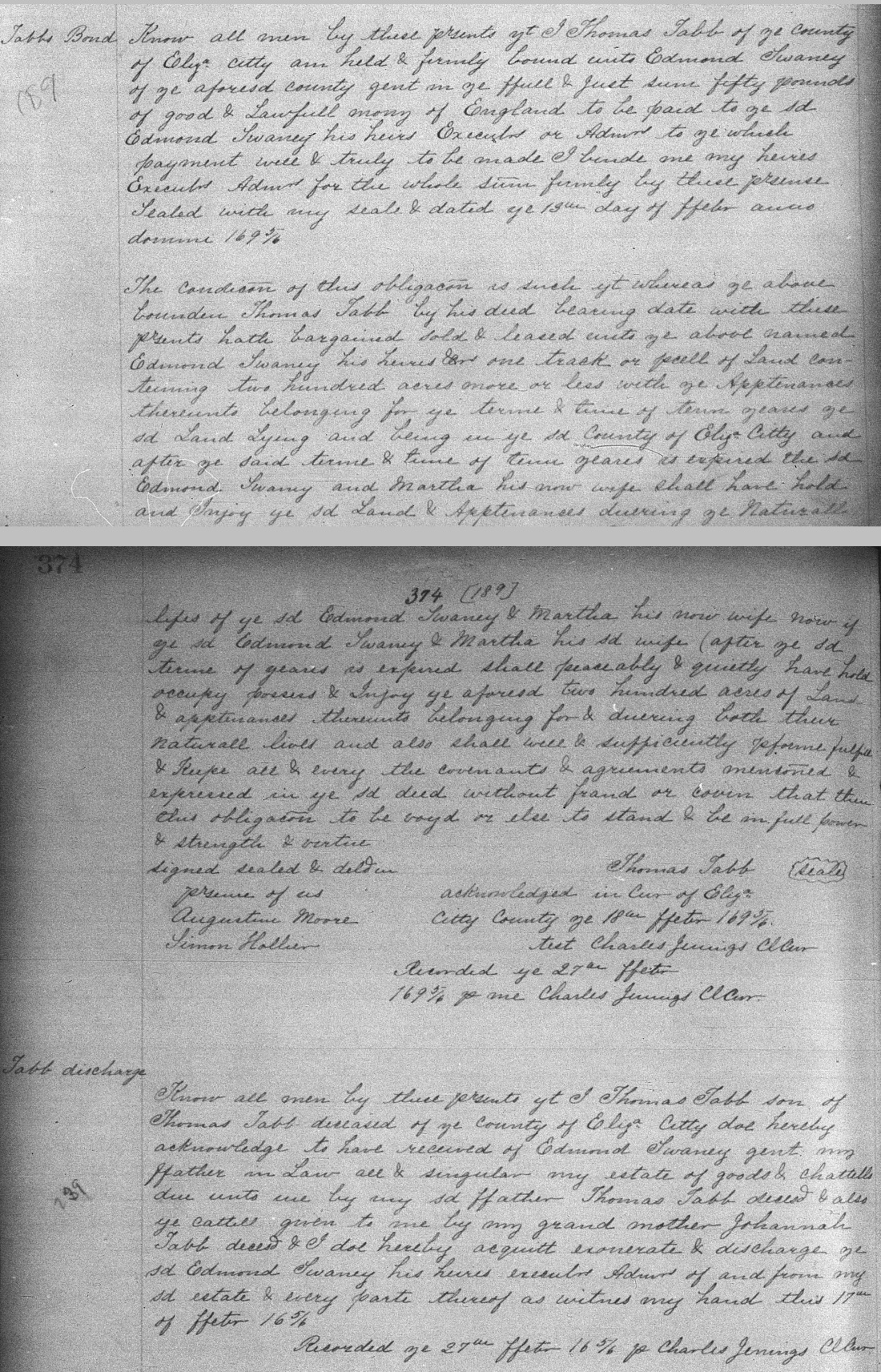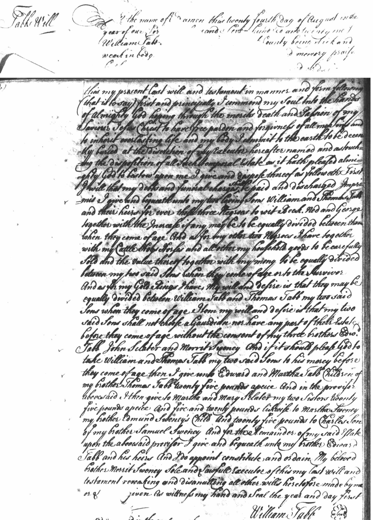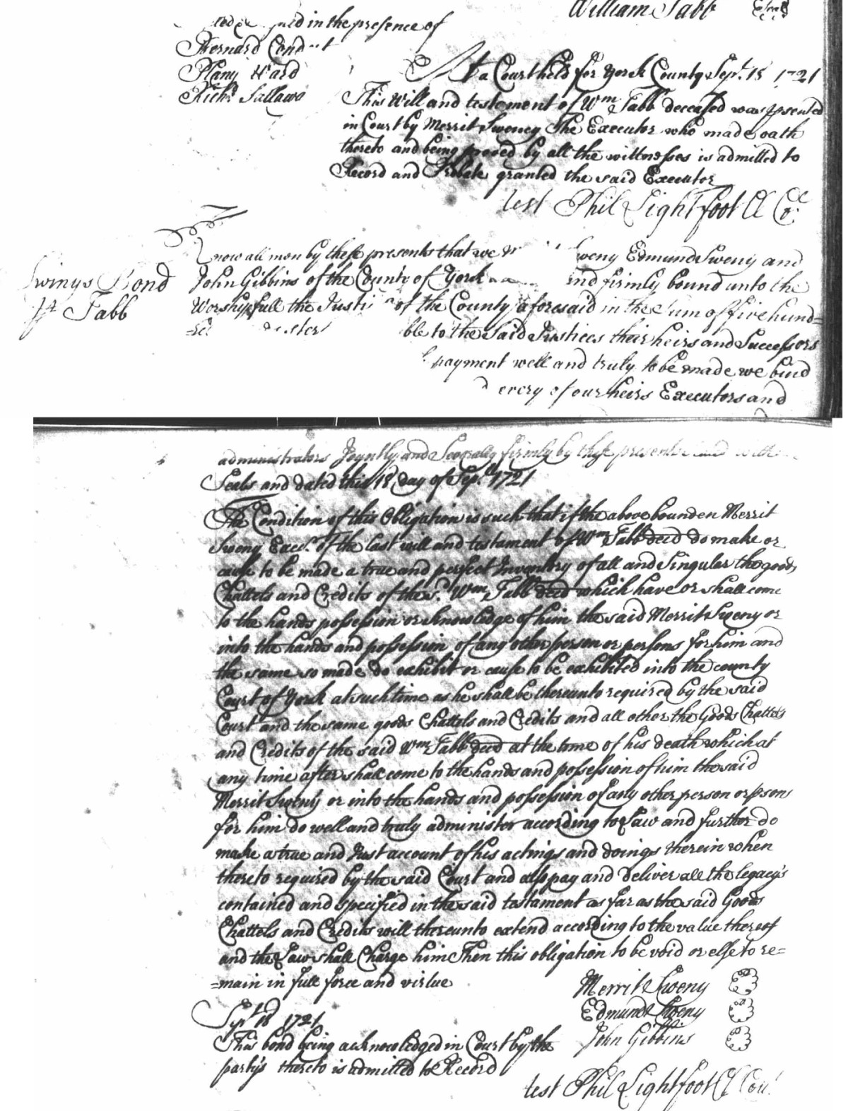 It's clear that Edmund Sweny, Jr. [II] was the father of sons named Edmund and Samuel based on Edward Day's last will, written on May 3, 1687, which mentioned "Edmund Swinney and Samuel Swinney, sons of Edmund Swinney and Martha, his new wife." Edmund Sweny's 1697 will also indicates he had other children who had not yet "come of age." We suspect one of those minors was Merritt Sweny who was a witness to Elizabeth Tabb's 1717 will and another was Lazarus Sweny who was mentioned in a York County legal document in 1726. In his 1732 last will, Lazarus Sweny called Samuel Sweny "My Brother" and mentioned two sons, Daniel and James. And, in William Tabb's 1721 will (see below), he called Merritt Sweny, Samuel Sweny and Edmund Sweny his brothers. We believe all this points to Edmund Sweny, Jr. being the father of the four sons usually attributed to Edmund Sweny, Sr.