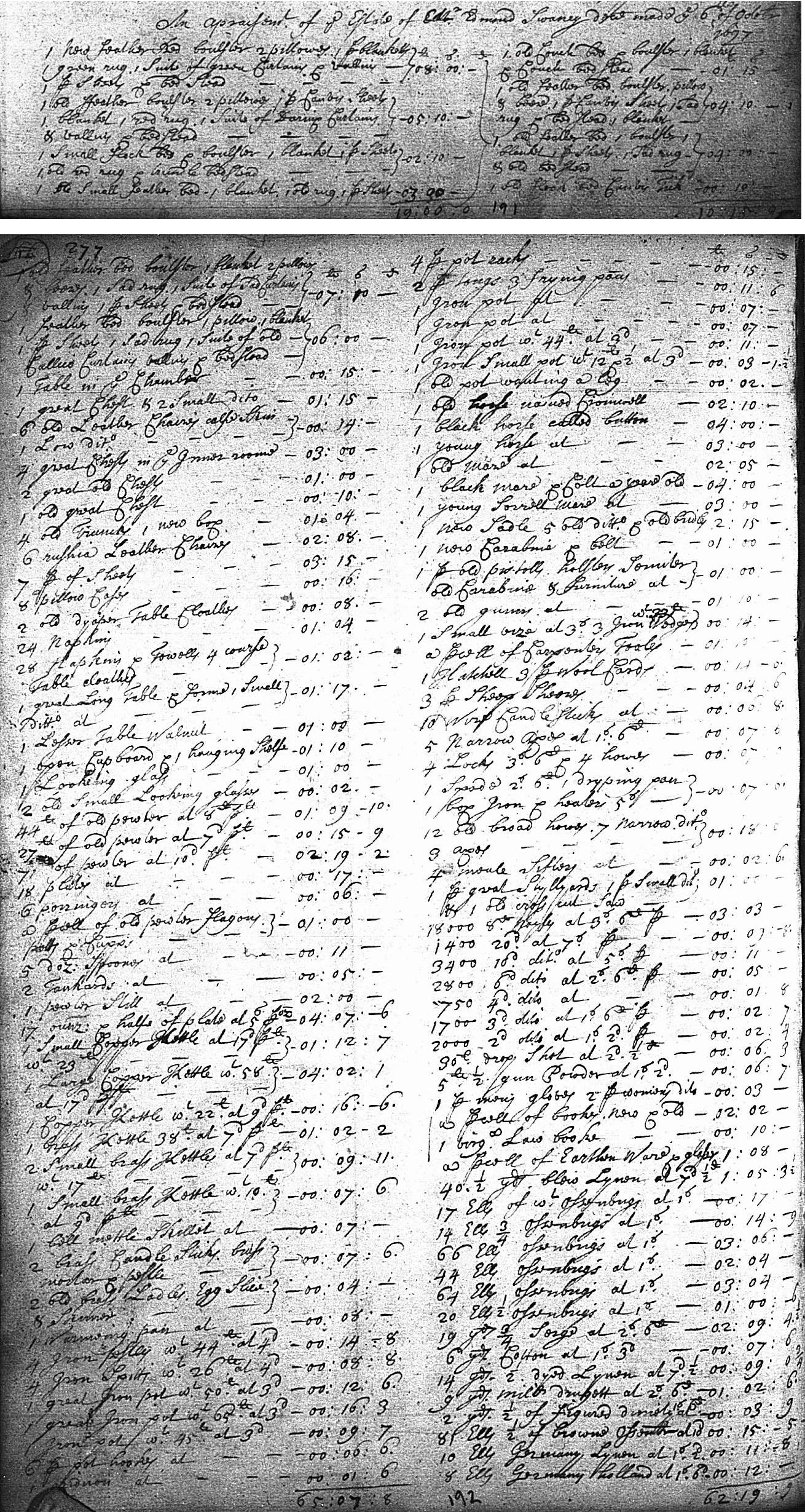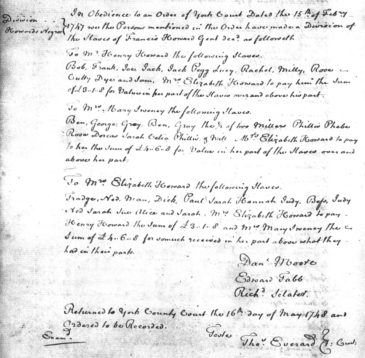 Merritt Sweny married Mary Howard around 1740. Mary was born (as Mary Hayward) on Sept. 10, 1722 in Charles Parish, York Co., Va. to Francis Hayward and his wife Martha (see birth record). Col. Francis Hayward seems to have changed his family name from Hayward to Howard in the late 1730s. In Charles Parish birth records there is a fairly clear demarcation between the two names starting in mid-1739. Based on the Charles Parish birth records, we have known that Merritt Sweny's wife was named Mary, but the discovery of probate records for Col. Francis Howard finally gave us her last name. His estate appraisal documents showed he was very prosperous. Although we have not found his will, the "Division of Slaves" made as part of the estate appraisal and accounting process shows that the slaves were divided between three of Francis's children, Henry Howard, Elizabeth Howard and Mary Sweney. Mary received more than a dozen slaves and we presume this happened because she was a sibling of Henry and Elizabeth.