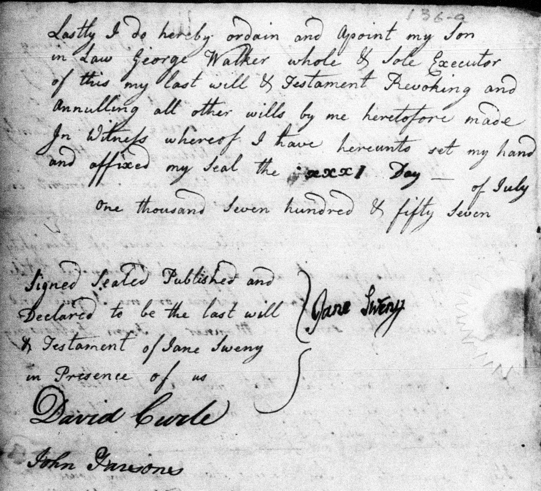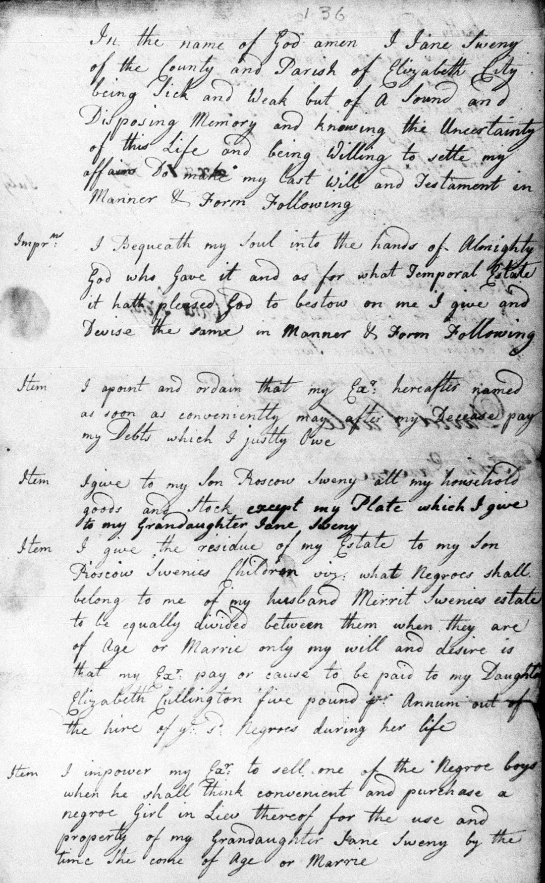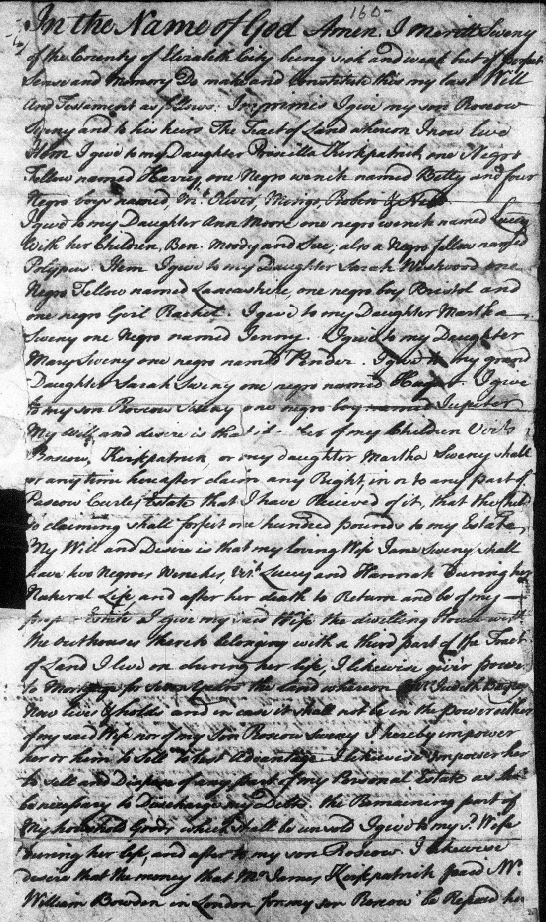 The last will of Merritt Sweny, son of Edmund Sweny, Jr. [II] and his first wife, was written in 1751 and recorded in Elizabeth City Co., Va. in 1752. The will names his son Roscow, daughters Priscilla Kirkpatrick, Ann Moore, Sarah Westwood, Martha Sweny, Mary Sweny, granddaughter Sarah Sweny, and his wife Jane Sweny. Jane Sweny's 1757 last will) adds unnamed children of Roscow Sweny, Elizabeth Cullington as her daughter, George Walker as her son-in-law, and granddaughter Jane Sweny.