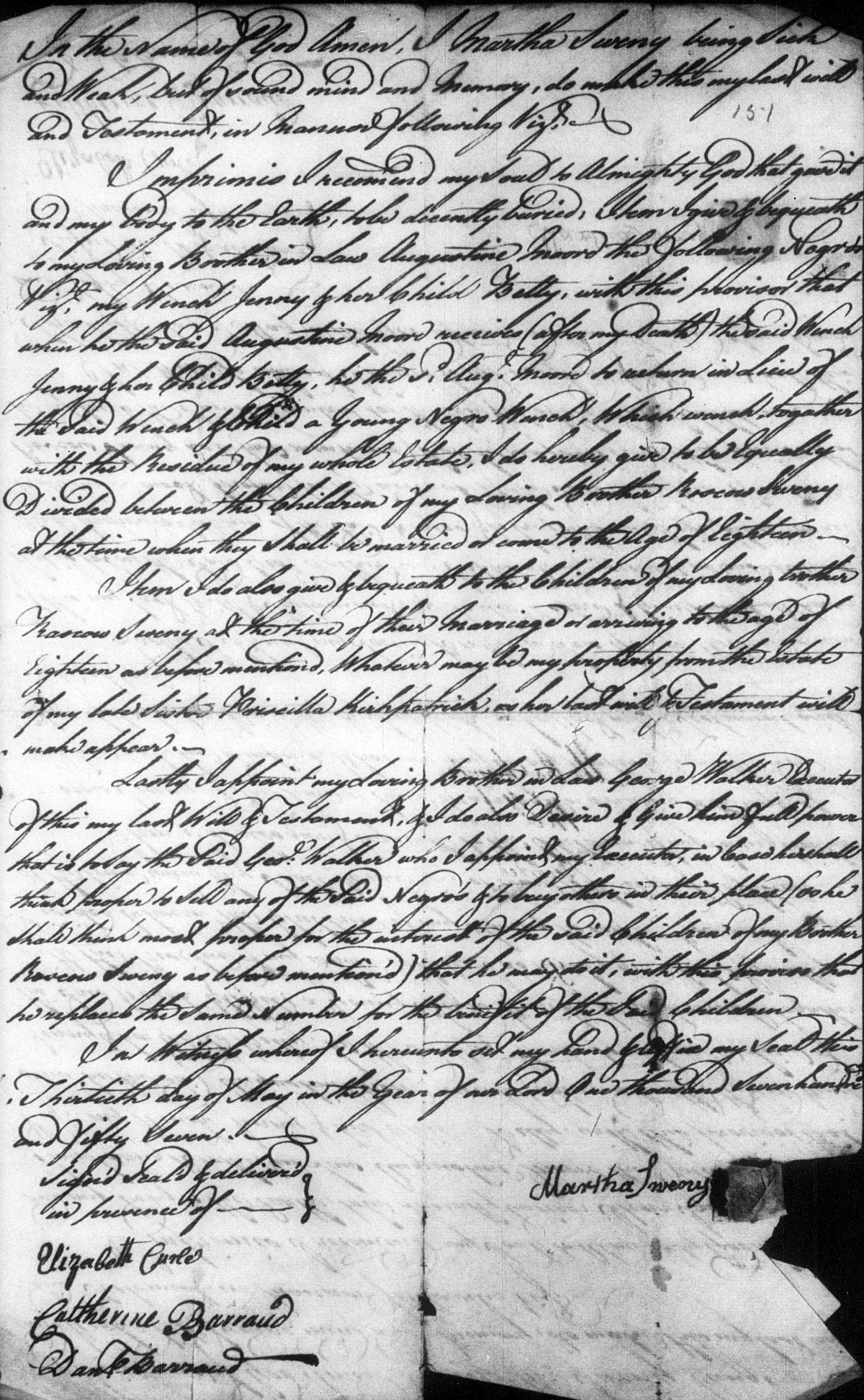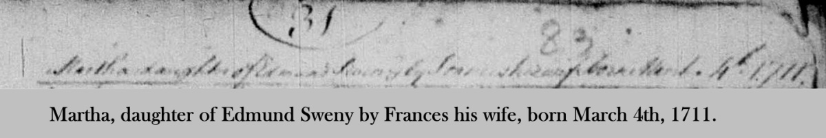 - Martha Sweny, b. March 4, 1712 (1711 according to the pre-Gregorian calendar) in Charles Parish, York Co., Va. (see birth record).