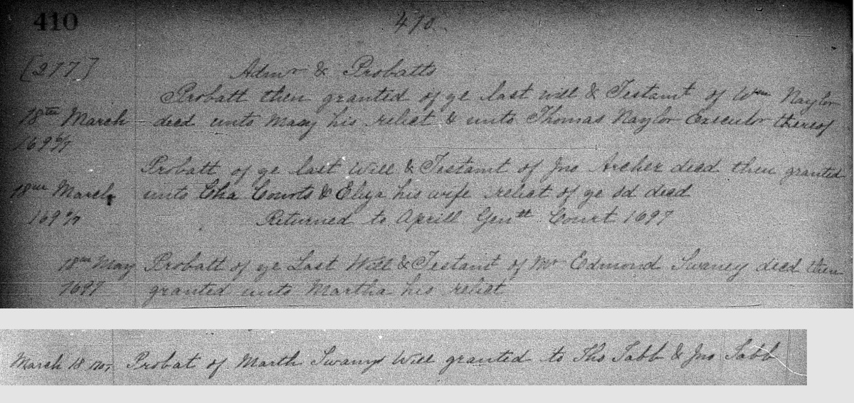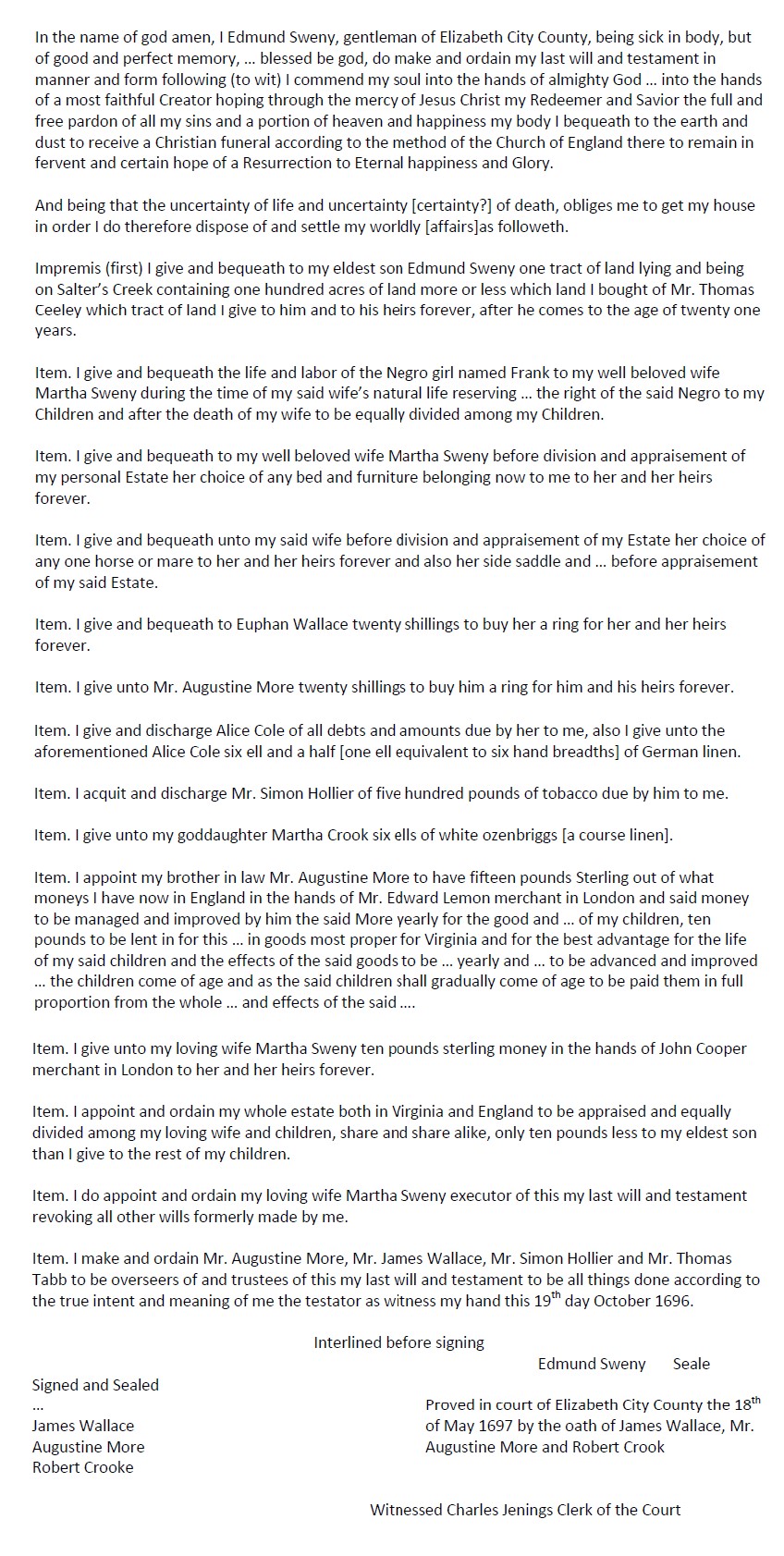 - Edmund Sweny, Jr. [II], b. bef. 1650, m1. unknown bef. 1678, m2. Martha (Moore) Tabb ~1687 in Elizabeth City Co., Va., d. bef. May 10, 1697 in Elizabeth City Co., Va.