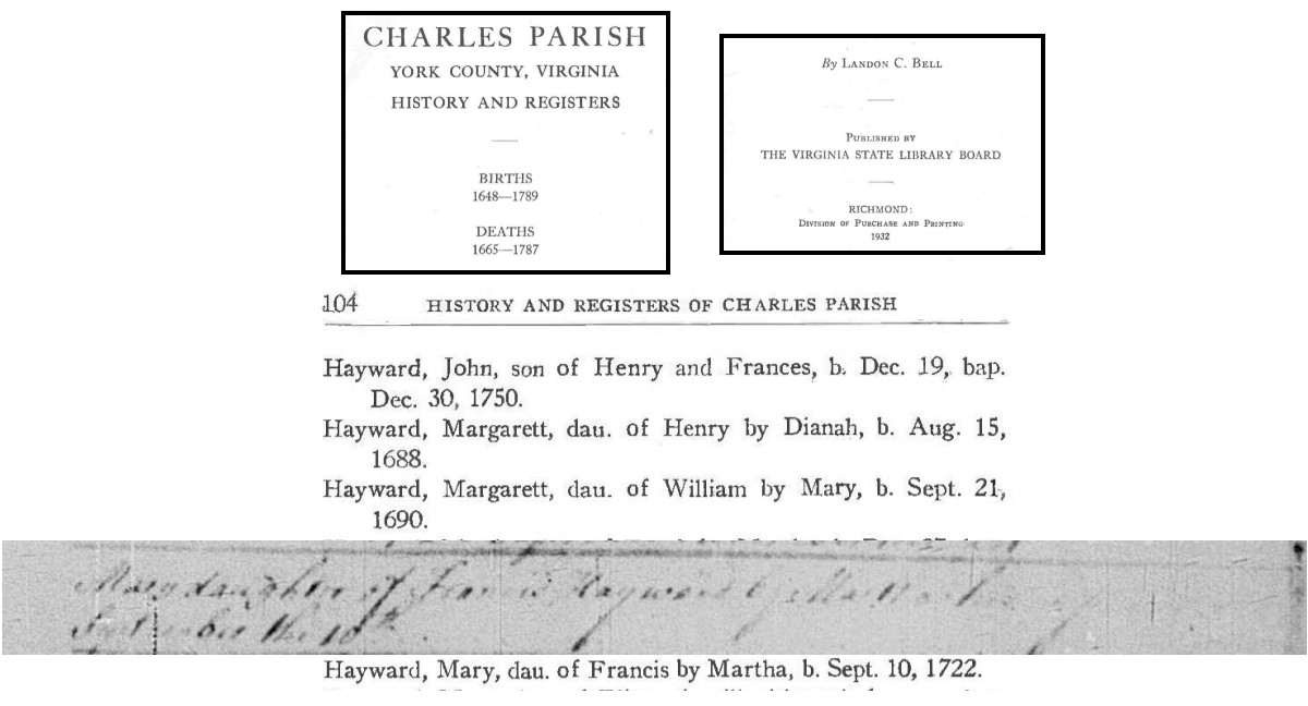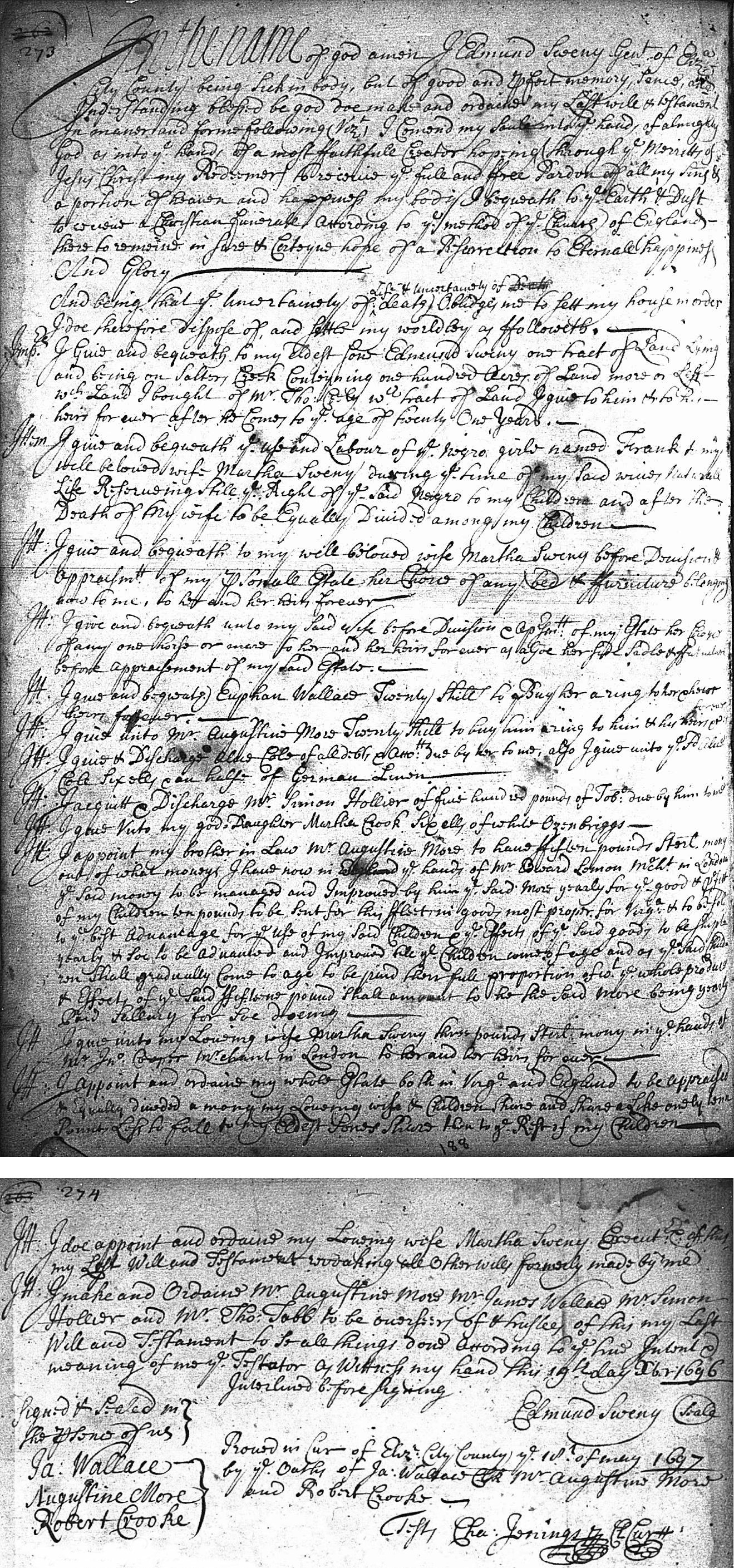 - Edmund Sweny [III], b. ~1678 in Elizabeth City Co., Va., m1. Frances Robinson ~1708 in York Co., Va., m2. Elizabeth (Wade) Hayward ~1722 in York Co., Va., d. May 9, 1728, in York Co., Va.