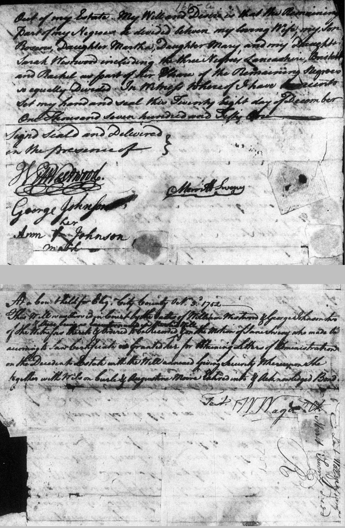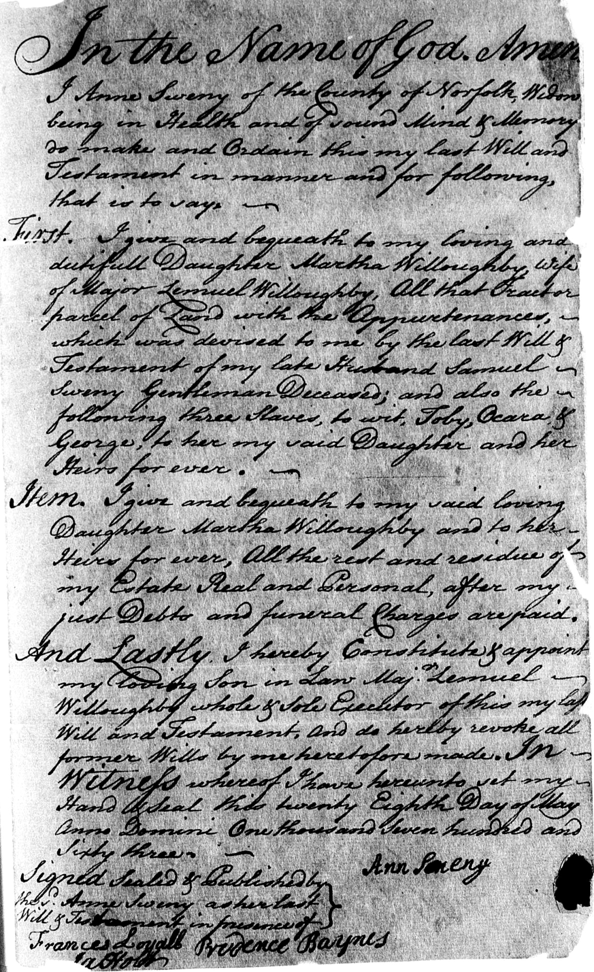 - Martha Sweny, b. bef. 1733, m. Lemuel Willoughby on Sept. 18, 1751 in Norfolk Co., Va., d. aft. 1767.