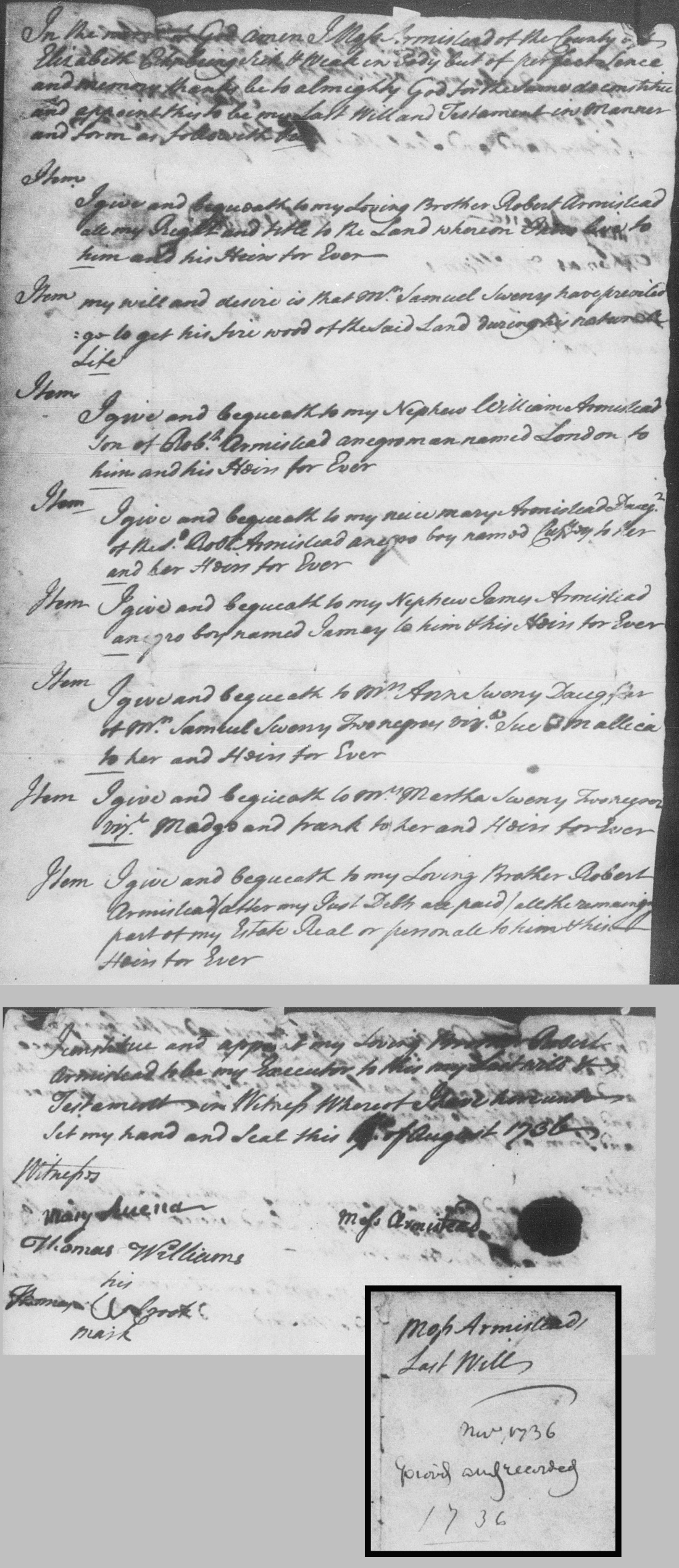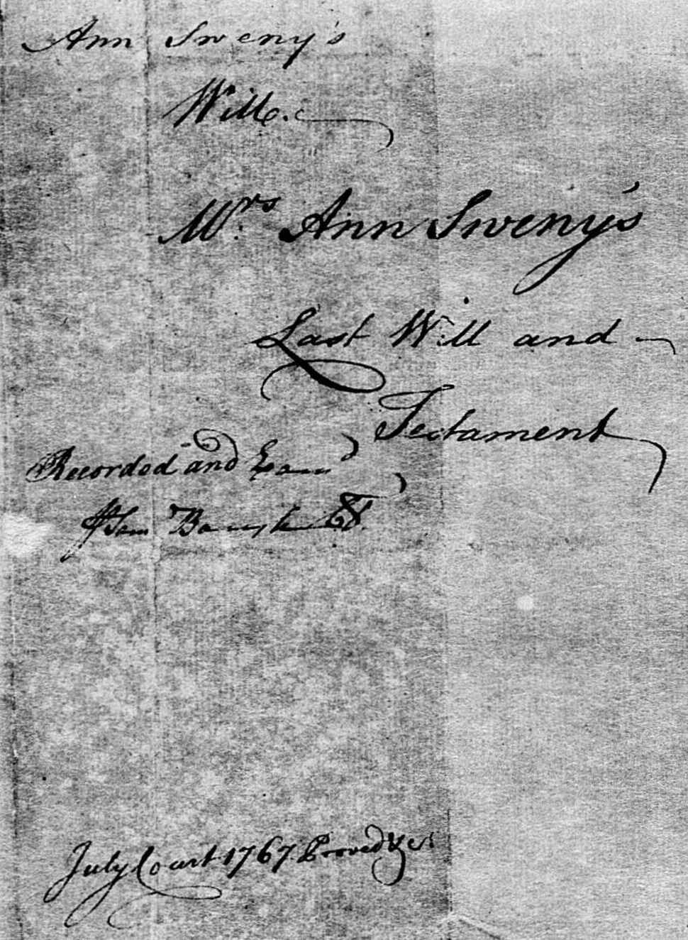 - Anne Sweny, b. bef. 1736 in Elizabeth City Co., Va. (mentioned as "daughter of Mr. Samuel Sweny" in Moss Armistead's 1736 last will).