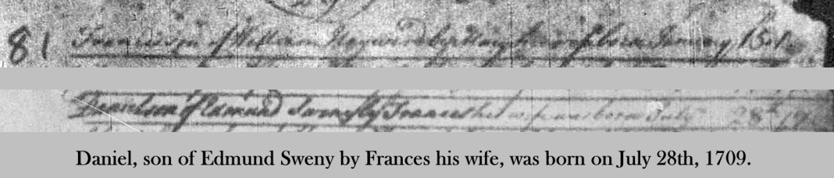 - Daniel Sweny, b. July 28, 1709 in Charles Parish, York Co., Va. (see birth record).