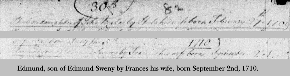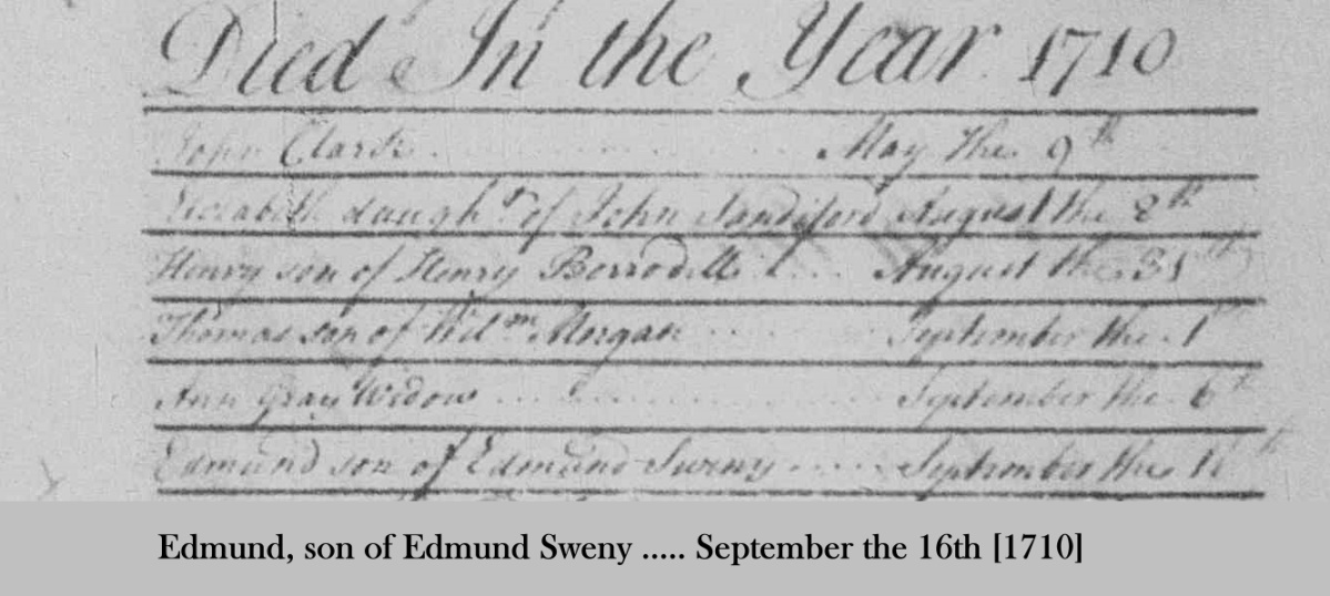- Edmund Sweny [IV], b. Sept. 2, 1710 in Charles Parish, York Co., Va. (see birth record), d. Sept. 16, 1710 in Charles Parish, York Co., Va. (see death record).