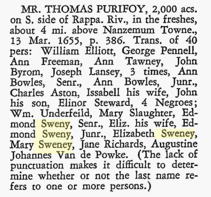 Since we are now confident that Rosamond Prewtt of Northumberland Co., Va. was the mother of our Samuel Pruitt, it is likely that Samuel's father was a Sweeney/Swinney living in, or passing through, the Tidewater/Northern Neck region of Virginia. Two families living in that area should be considered as prime candidates for being the progenitors of our Pruitt line and the Sweeney/Swinney/White line. The first family was headed by Edmund Sweny, Sr. who was born in England or Ireland in the early 1600s. He immigrated to the Tidewater area of Virginia around 1655. Thomas Purifoy's headright patent indicated that Edmund Sweny's wife Elizabeth, son Edmund, Jr. and daughters Elizabeth and Mary accompanied him to Virginia. Based on what we know about his children and grandchildren, Edmund Sweny, Sr. probably lived in Elizabeth City Co., Va. (Hampton, Va. today). We also know that Thomas Purifoy was a justice of Elizabeth City in 1652, making this the likely location where he obtained the patents for the Swenys. The second family under consideration was descended from Thomas Swaine who arrived in Northumberland Co., Va. around 1653. Charles Swanie, a possible son or grandson of Thomas Swaine, filed several court cases against a Morris Fitzgerald in Northumberland County in 1707. We can find no details at this time about the nature of the court cases; however, Morris Fitzgerald ultimately traveled with Rosamond (Prewtt) Fitzgerald to Prince George's Co., Md. a few years later. If our theory is correct that the Sweeneys and Whites were descended from the Tidewater Swenys and, therefore, that the Pruitts must have descended from a brother or cousin of Edmund Sweny, Sr., then the Northumberland Swaines would be prime candidates for that role. Unfortunately, aside from a few names, we know very little about this family. The narrative that follows is entirely centered on the Tidewater Swenys. As we perform more research on the Northumberland Swaines, we will provide that information as well.