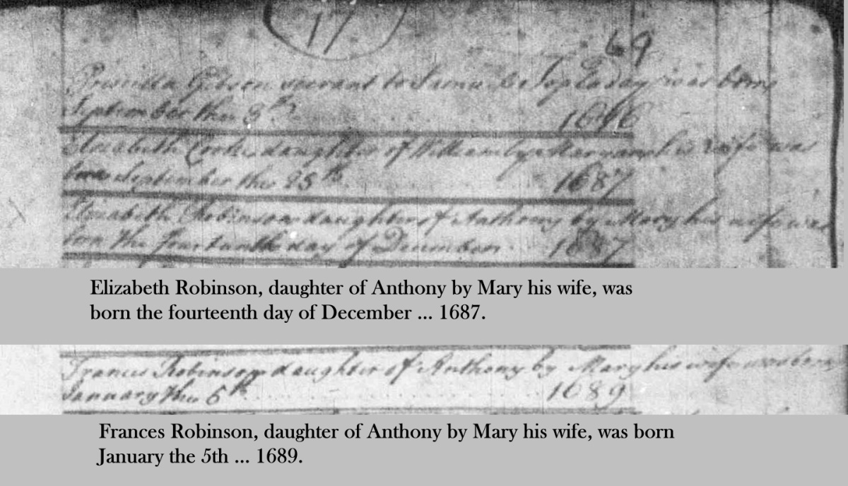 While Edmund Sweny [II] seems to have lived in Elizabeth City Co., Va. most of his life, his son Edmund Sweny [III] moved to nearby York Co., Va. where he married Frances Robinson around 1708. Frances was born to Anthony and Mary (Starkey) Robinson on Jan. 5, 1690 (1689 according to the pre-Gregorian calendar) in York Co., Va. Records in Charles Parish, York Co., Va. indicate that Edmund and Frances Sweny had three children, Daniel, Edmund and Martha, born between 1709 and 1711. Frances Sweny died on May 7, 1718. While there is no record of any other births to Edmund and Frances Sweny in Charles Parish records, it appears they had a fourth child, Merritt Sweny. Most researchers indicate he was born in 1714; however, another view, based mostly on wills and other legal records, suggests Merritt's mother could have been Edmund's second wife Elizabeth (Wade) Hayward. Based on our analysis of those records, we have concluded that Marritt Sweeney was the son of Frances (Robinson) Sweny and likely was born between 1714 and the date of her death in 1718. For the complete analysis that went into determining the name of Edmund Sweny's second wife and the mother of Merritt Sweny, see The Search for Elizabeth Sweny.