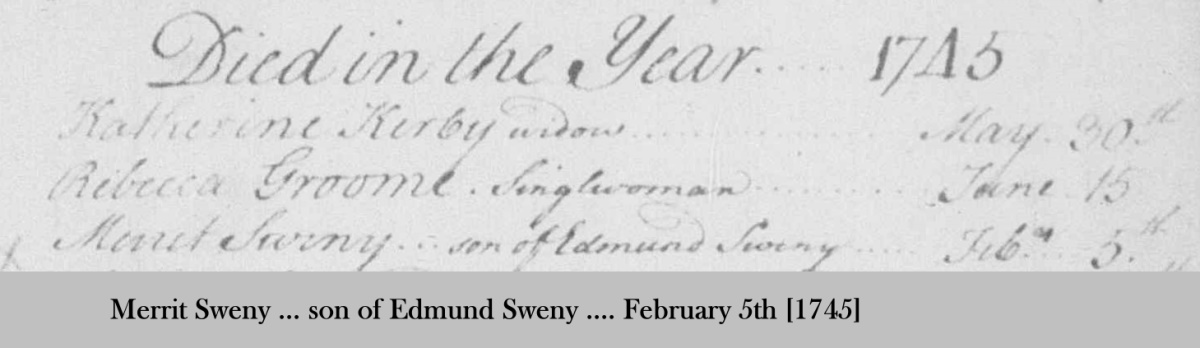 We were able to flesh out Merritt Sweney's line based on several birth records found in the surviving Charles Parish records in York Co., Va. We also found a record of an appraisal of the estate of Merritt Sweney, Jr., deceased, dated May 19, 1746, in York Co., Va. A Charles Parish, York Co., Va. death record indicates Merrit Sweny, "son of Edmund Sweny" died on Feb. 5, 1746 (1745 in the Julian Calendar). In the appraisal, Merritt Sweny likely earned the Jr. after his name by being the younger of two Merritt Swenys in the area and not because he was the son of Merritt Sweny. This is reinforced by the mention of Merritt Sweeny as the son of Elizabeth Sweeny, widow, in her 1729 Last Will (see above for more about her will). Unfortunately, we have not found the actual will of Merritt Sweny. Some reseachers indicate Merritt Sweny died intestate, which makes sense since he was so young when he died.