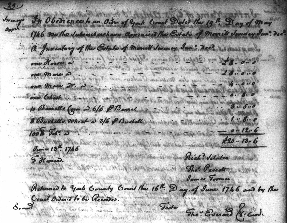 - Merritt Sweny, b. ~1714 in York Co., Va., m. Mary Howard ~1740, d. Feb. 5, 1746 in York Co., Va.