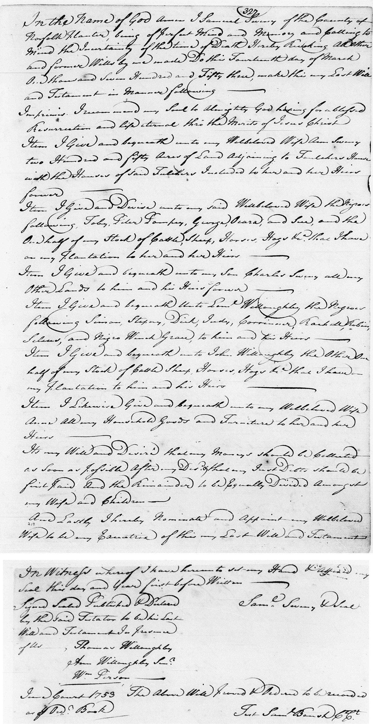 In Samuel Sweny's 1753 last will recorded in Norfolk Co., Va., he named his wife Ann and son Charles and left legacies to John and Lemuel Willoughby. Lemuel married Martha Sweny in Norfolk Co., Va. in 1751 suggesting that Martha was the daughter of Samuel. This is confirmed by Samuel's wife's 1763 last will (recorded in 1767) in which she named Martha Willoughby as her "loving Daughter."