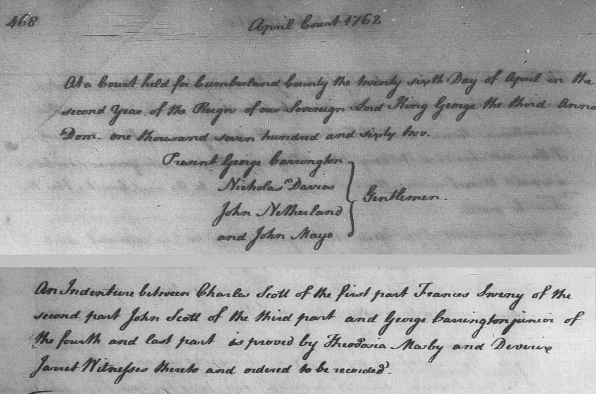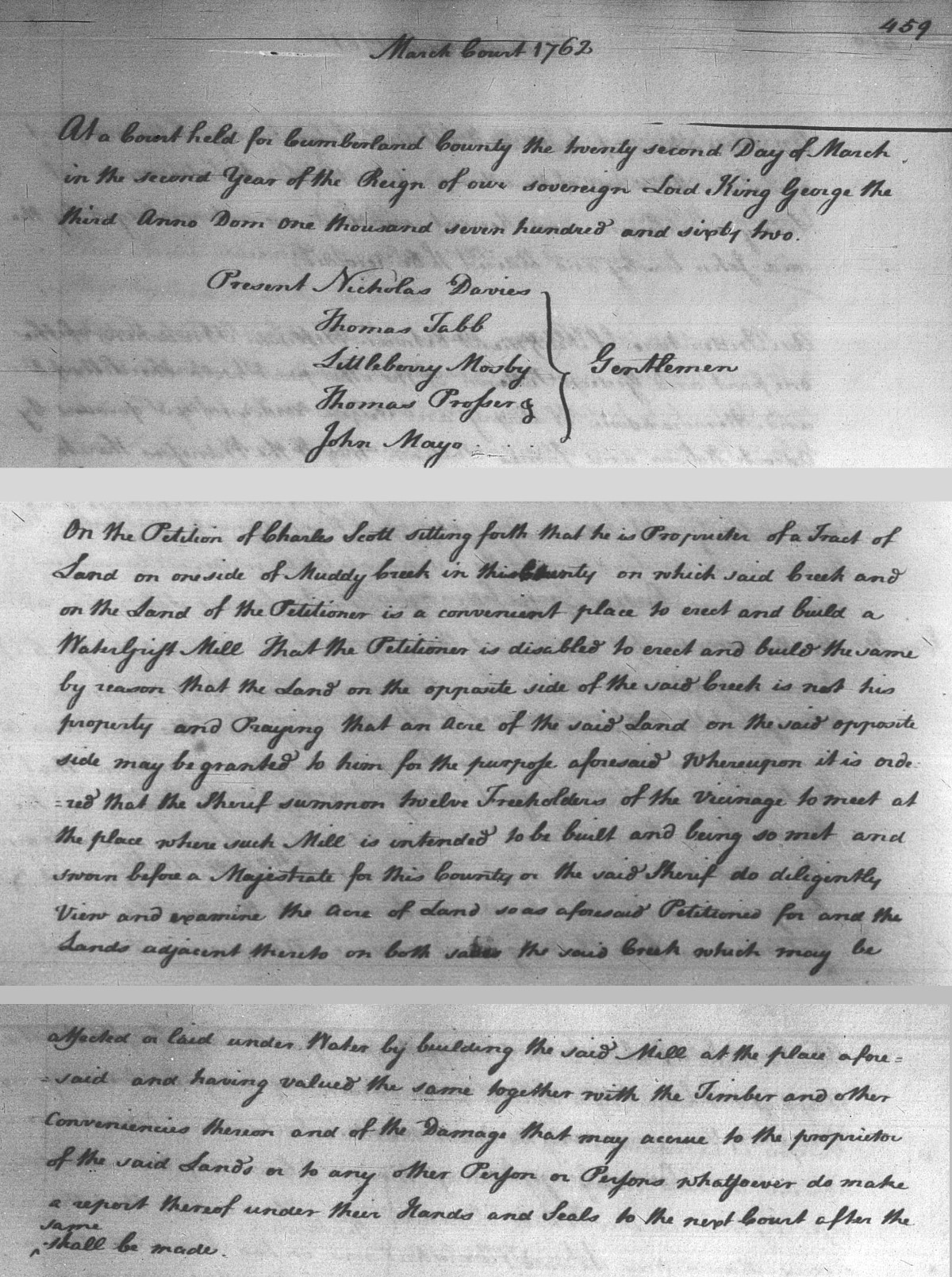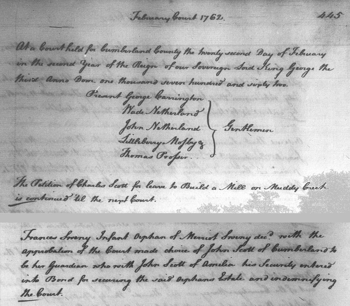 Documents uncovered in Cumberland Co. and Amelia Co., Va. represent the first direct evidence that Swenys from the Tidewater region migrated into an area of Virginia where the ancestors of our modern-day Sweeneys/Swinneys were first recorded. The first two records were from the Cumberland County February Court 1762, which met on Feb. 22, 1762. First, a request by Charles Scott to build a mill on Muddy Creek was continued to the March Court. The same February Court also approved John Scott, Charles Scott's older brother, as the guardian of Frances Sweny, "infant orphan of Merritt Sweny, decd." (see the second part of the image above). In colonial Virginia, anyone under 21 years of age was legally an infant. Since Merritt Sweny's daughter, Frances, was born on June 21, 1744, she was a 17 year old infant in the eyes of the Cumberland County court. In the March Court 1762, which met on March 22, 1762, the decision was made for Charles Scott to meet with the owners of the land on the opposite side of Muddy Creek to see if a deal could be worked out for him to compensate the owners of the land for any damages that might accrue by building his "Watergrist Mill." Finally, at the April Court 1762, which met on April 26, 1762, an indenture was filed "between Charles Scott of the first part, Frances Sweny of the second part, John Scott of the third part and George Carrington junior of the fourth part." We suspect this indenture was the result of the negotiations between Charles Scott and the landowners for the development of his "Watergrist Mill." What this indenture likely tells us is that Charles Scott and Frances Sweny had not married by April 26, 1762, that the land on which the water mill was to be built was owned by Frances Sweny and that the guardianship was created, in part, to smooth the way for building Charles's grist mill. We can assume Charles and John Scott were sincerely looking out for Frances's interests since, later in 1762, Charles married Frances Sweny (see marriage record). Charles Scott and Frances Sweny remained married until her death in 1804 in Woodford Co., Ky. (see below for more on Charles Scott's career).