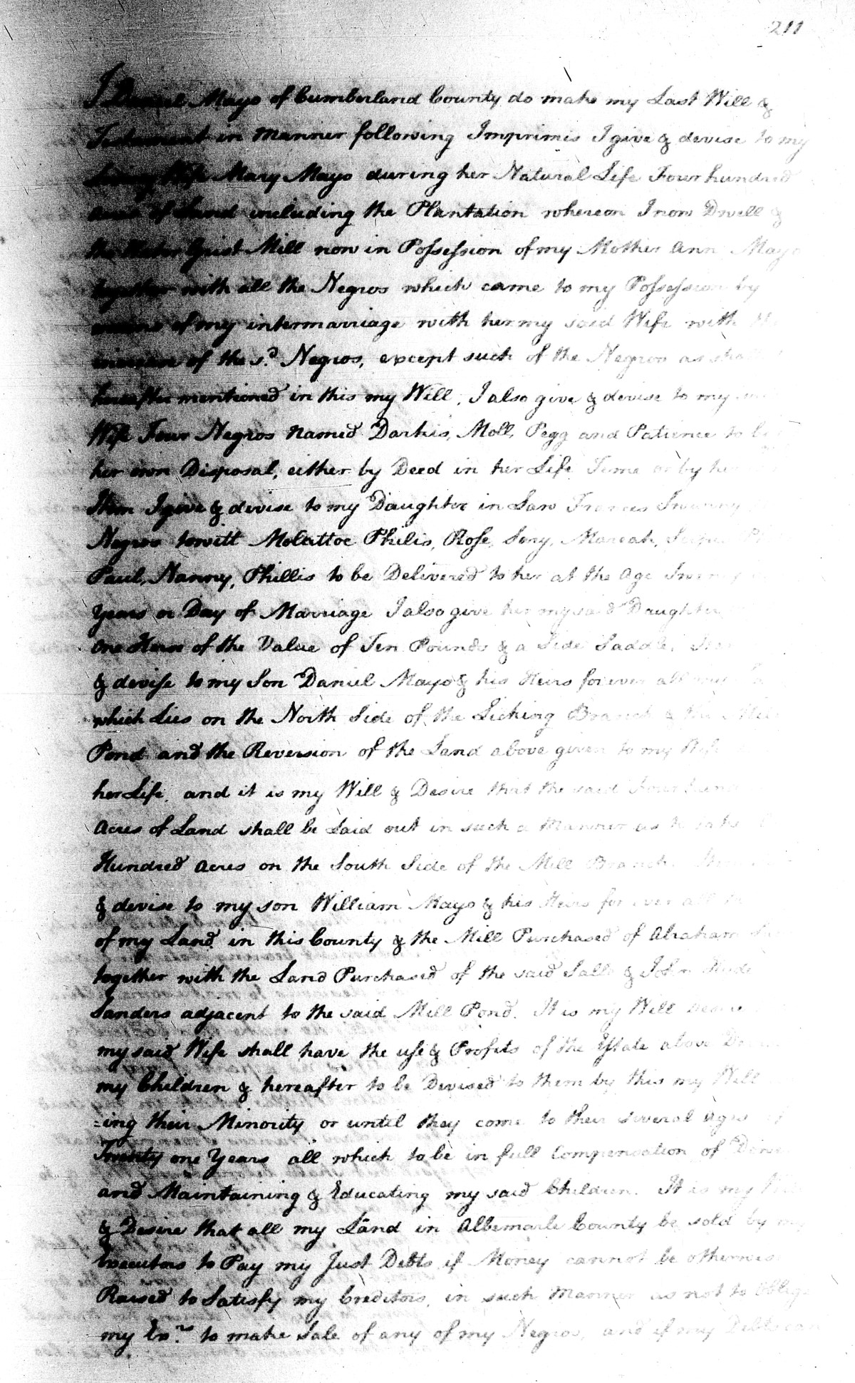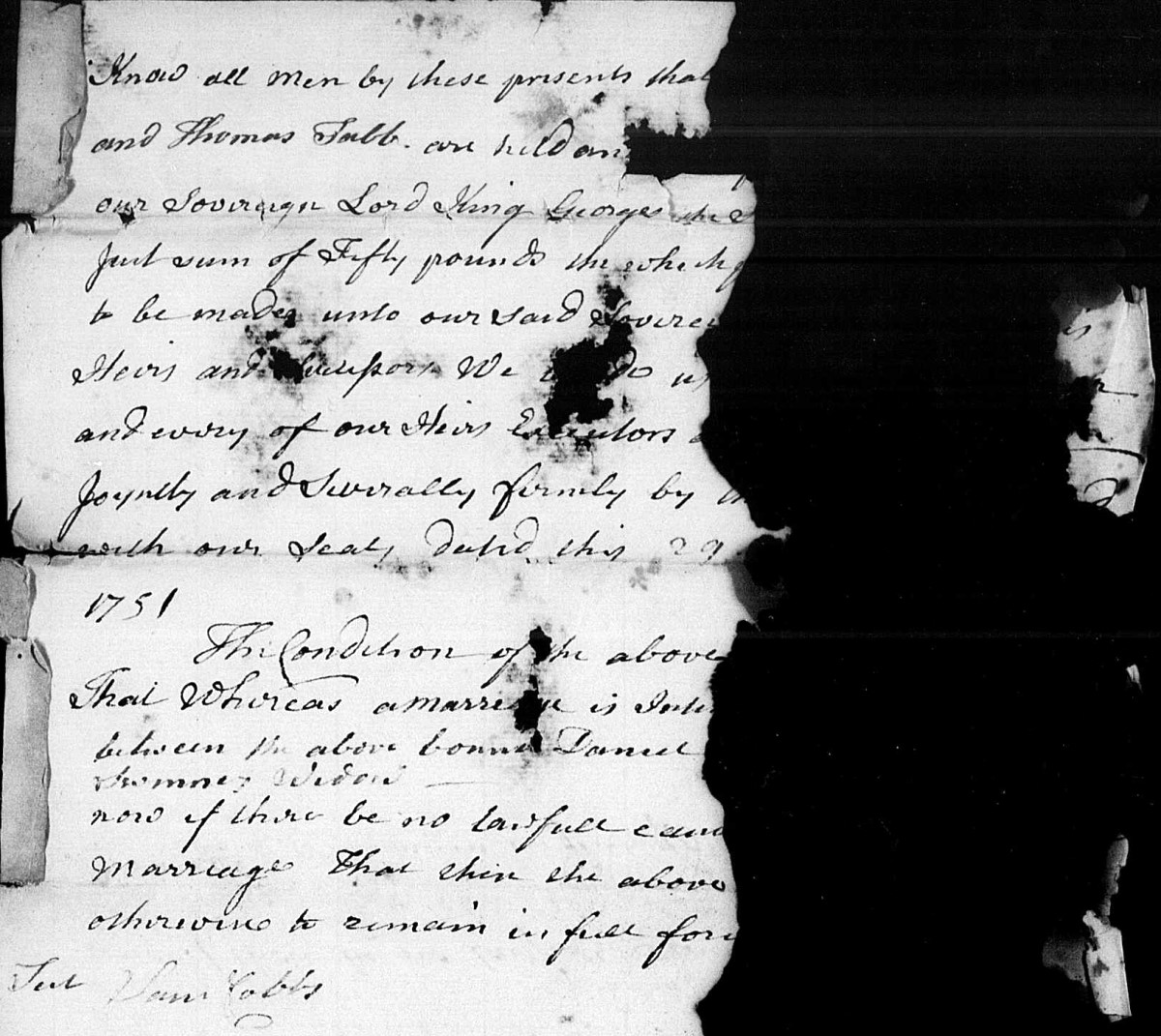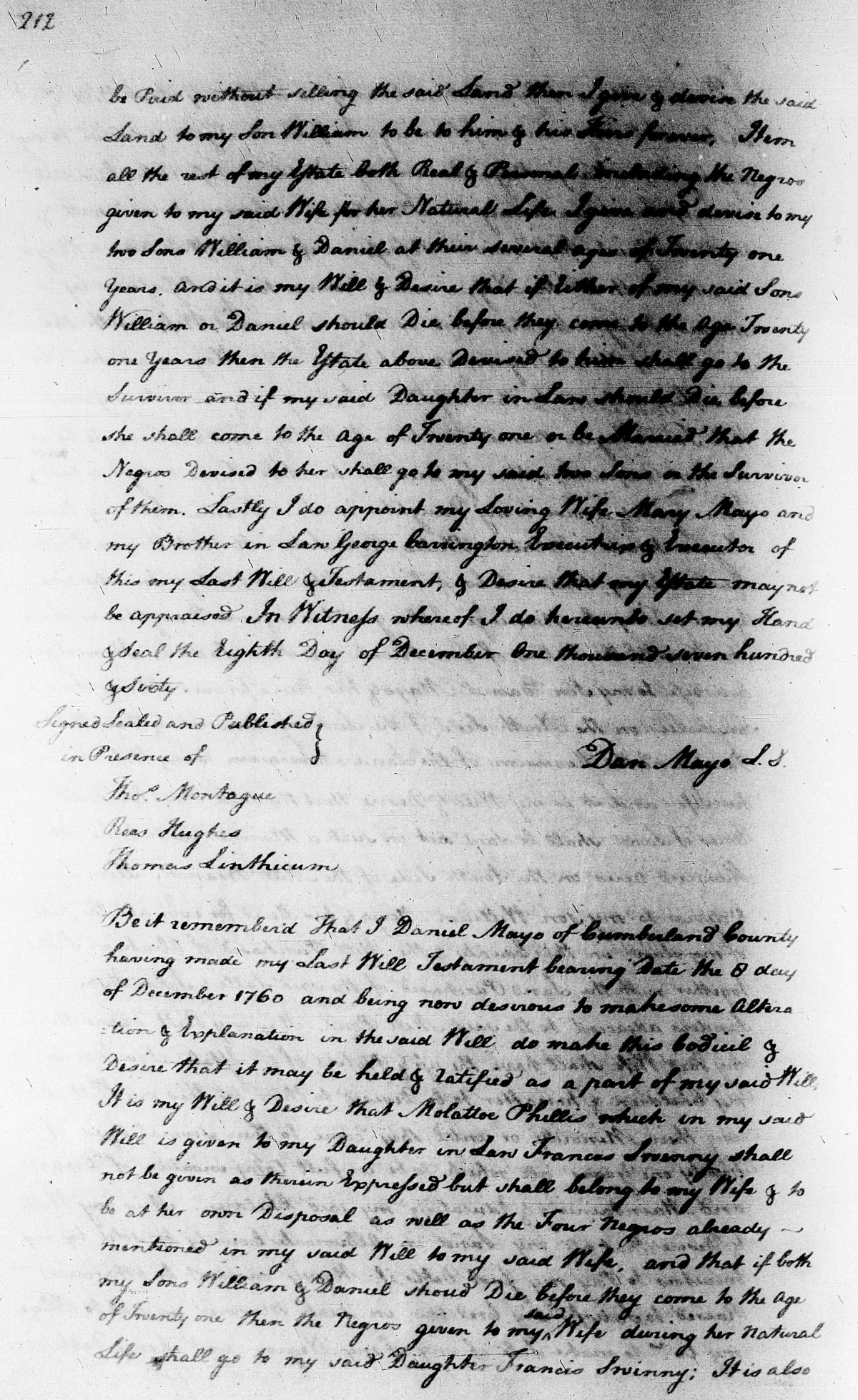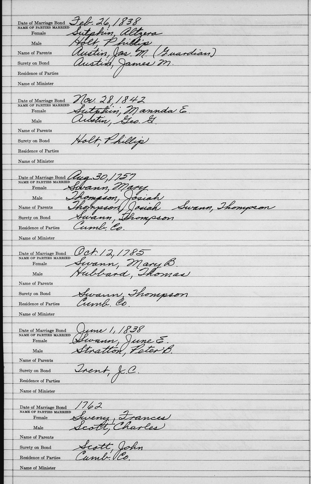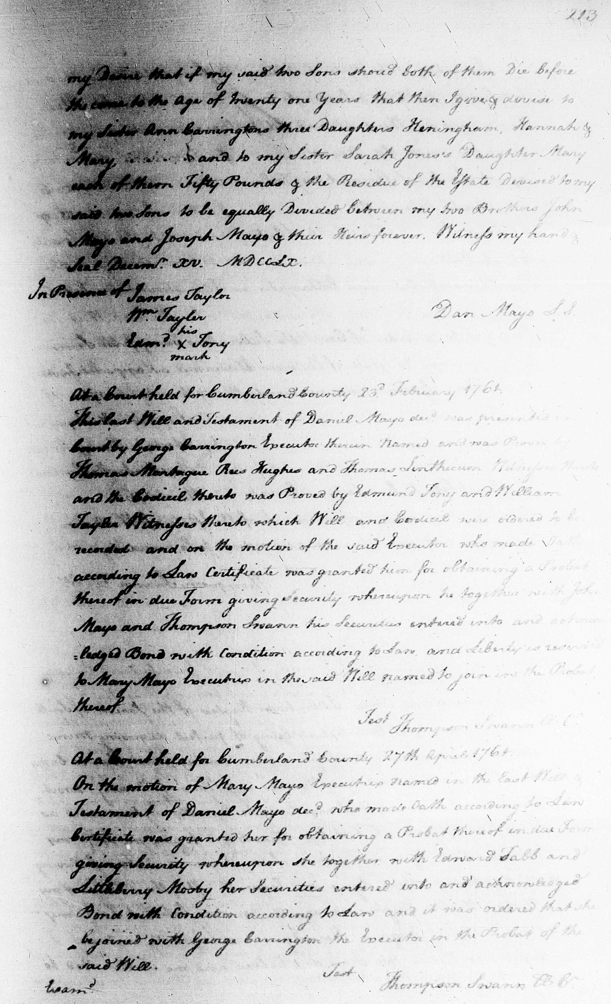 So, how and when did Frances get to Cumberland County? Her father, Merritt Sweny had died on Feb. 5, 1746 (1745 according to the Julian calendar) in Charles Parish, York Co., Va. Her mother's father, Francis Howard, died on March 14, 1747 (1746 according to the Julian calendar). It took awhile for the affairs of both Francis and Merritt to be wrapped up, but it appears that soon after the process was completed, Mary Sweny moved to Amelia Co., Va. We suspect the Tabb family may have facilitated the move, since Tabb family members were already living in that area. Mary Sweny's mother Martha was a Tabb and the Sweny family had long ties with the Tabb family. By way of corroboration, we found a damaged 1751 marriage document in Amelia County. The bride appears to be a "Swinney Widow"; the groom is Daniel, whose last name is torn away; and the co-surity was Thomas Tabb. This could very well be the marriage record of Frances Sweny's mother, Mary Sweny, but too much information is missing to make it definitive. At the time, Frances would have been seven years old and Mary would have been a 29 year old widow of five years. Our next find would seem to confirm this as her marriage record. On February 23, 1761, the last will of Daniel Mayo was recorded in Cumberland County court. He left 400 acres to his wife Mary and several slaves including a few names that appeared on the list of slaves Mary inherited from her father. He also left slaves to his "Daughter in Law [stepdaughter] Frances Swenny." Again, the list of names included some that are familiar from Mary's inheritance. Daniel Mayo also left property to his sons Daniel Mayo and William Mayo. Both sons and Frances Sweny were described as being under the age of 21. We do not know if the two sons were Daniel Mayo's children by a previous marriage or two children he and Mary had after they were married. Mary (Sweny) Mayo died intestate before July 21, 1773, the date her inventory and appraisal were filed with the Cumberland County court. Of course, without a will, we do not know how her estate was apportioned. In the few records found to date, we also do not know what happened to her son Daniel Sweny. There were several Daniels in the Sweny family and one of them appeared in York County records beginning in 1760 when Daniel Sweny, son of Merritt and Mary, would have been 17 years of age. It may be that Daniel stayed behind in York County and lived with one of the families that were close to the Sweny family.