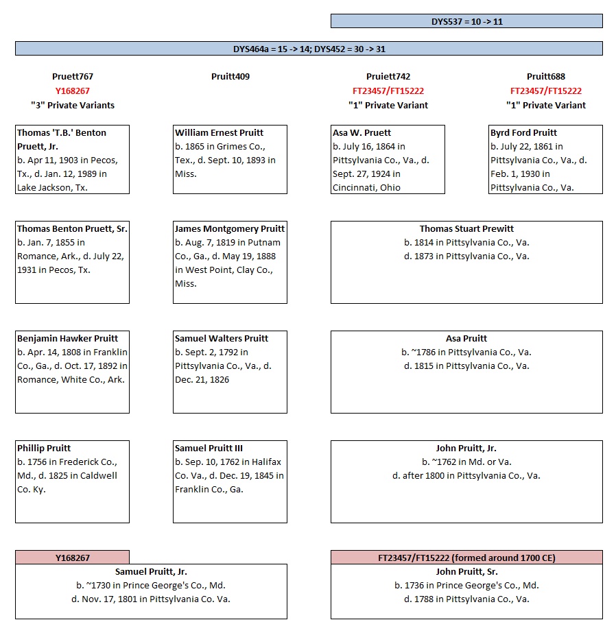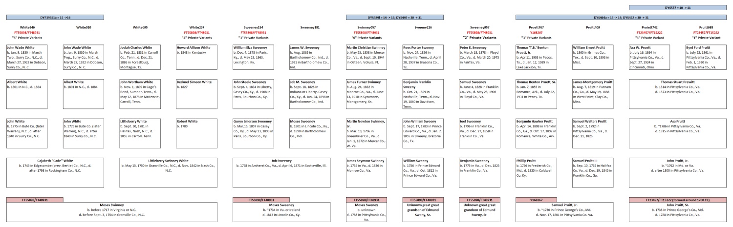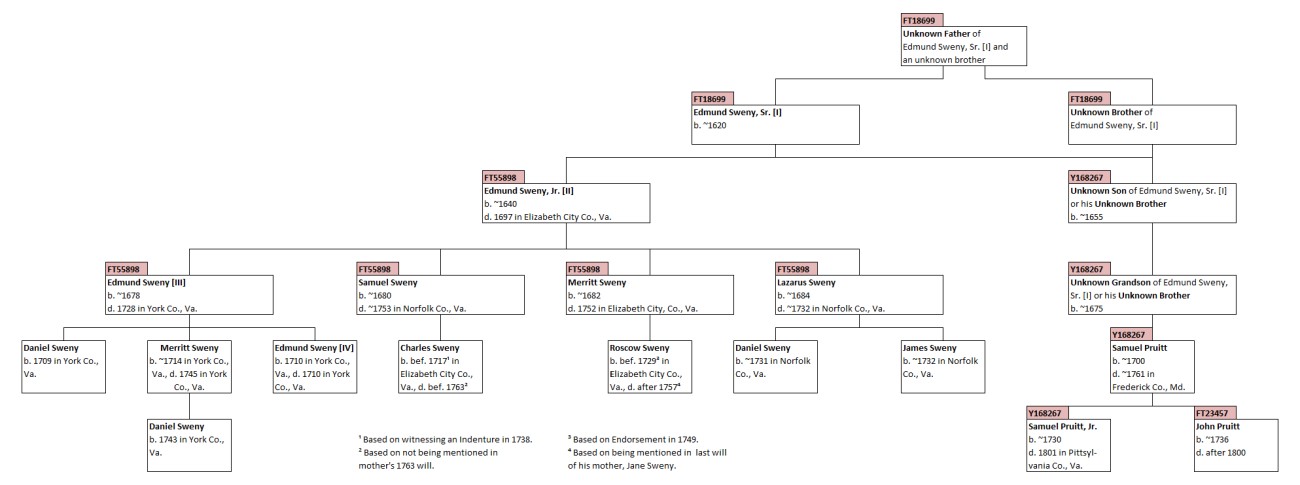 The above patrilineal tree is based on what we know so far about the Swenys in early colonial America. It assumes the Swenys of Elizabeth City Co., Va. were the progenitors of both the modern-day Sweeney/Swinneys/Whites who test positive for FT55898, as well as the modern-day Pruitts descended from Samuel Pruitt. As we'll see below, that assumption has not been proven. As far as we can determine based on wills and birth records, Edmund Sweny, Jr. had four sons and all must have been positive for FT55898. We can deduce this based on the fact that we've found five modern day Sweeney/Swinneys and Whites who are all positive for FT55898 and none share a more recent terminal SNP. On average, it takes two or three generations for a new SNP to emerge in a family line; therefore, it is likely that these Sweny descendants broke off from each other pretty soon after the generations shown on this tree. The descendants of Samuel Pruitt, Sr. must have been a separate branch from Edmund Sweny, Jr. since they are not positive for FT55898. That means Samuel Pruitt could have descended from a son or brother of Edmund Sweny, Sr., but not from Edmund Sweny, Jr. Given that Samuel was born 45 years after the Swenys arrived in the colonies, our bet would be that he was a grandson or great-grandson of Edmund Sweny, Sr., through an unknown son of his, or he was the son or grandson of an unknown brother of Edmund Sweny, Sr. In either case, Edmund Sweny, Sr. would have to have had another son (or an immigrant brother) who has not shown up in historical records.