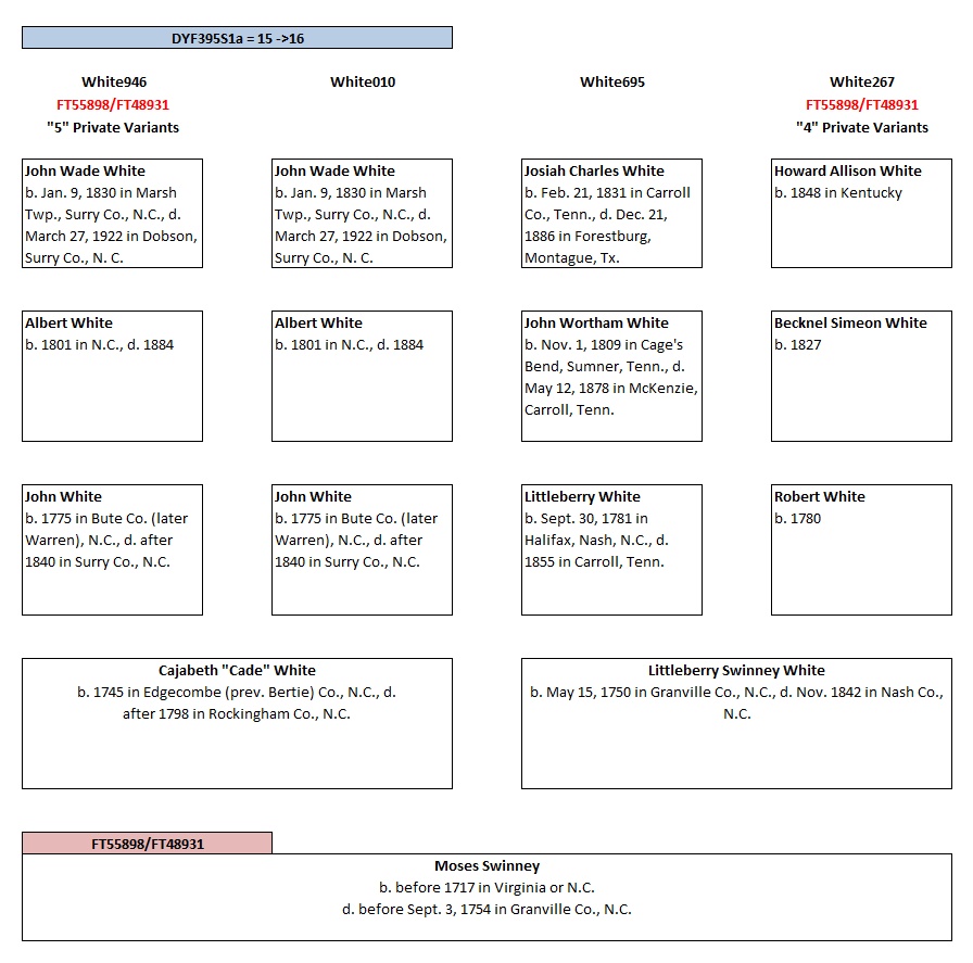 Elizabeth City Co., Va. is just south of Gloucester County, the presumed base of operations for Col. Robert Abrahall. Gloucester County is just south of Northumberland County. The three locations are around 60 to 70 miles apart in total. It's not known whether any of these individuals, Col. Robert Abrahall, the Swenys or Rosamond Prewtt, knew each other. All of this needs to be researched in more depth to see if a more detailed family tree can be constructed and to see if any of our Swinneys/Sweeneys/Whites/Pruitts can be tied to the descendants of Edmund Sweny, Sr. Geography and Y-DNA testing provide the basis for the scenario that a descendant of an unknown son of Edmund Sweny, Sr. or an unknown brother, could have fathered Rosamond Prewtt's son. The fact that there are at least six identified male descendants (and likely many more when the four sons' vital reocrd gap years are considered) in the second and third generations after Edmund Sweny, Jr. provides a basis for presuming that these children are in the lines of Swenys who carried on the single SNP (FT55898) in distinct paternal lines to our modern-day Sweeneys, Swinneys and Whites. These Sweny children would have had to migrate west and south of the Tidewater region to be the progenitors of each of our modern-day Sweeney lines. More work needs to be done to uncover the records necessary to prove relationships back to the early Swenys. We will need to work forward in time from Edmund Sweney, Sr. and his family and backwards in time from the earliest known ancestors of our Swinney/Sweeney/White testers. With that in mind, here is a graphic showing the earliest known ancestors of each of our testers.