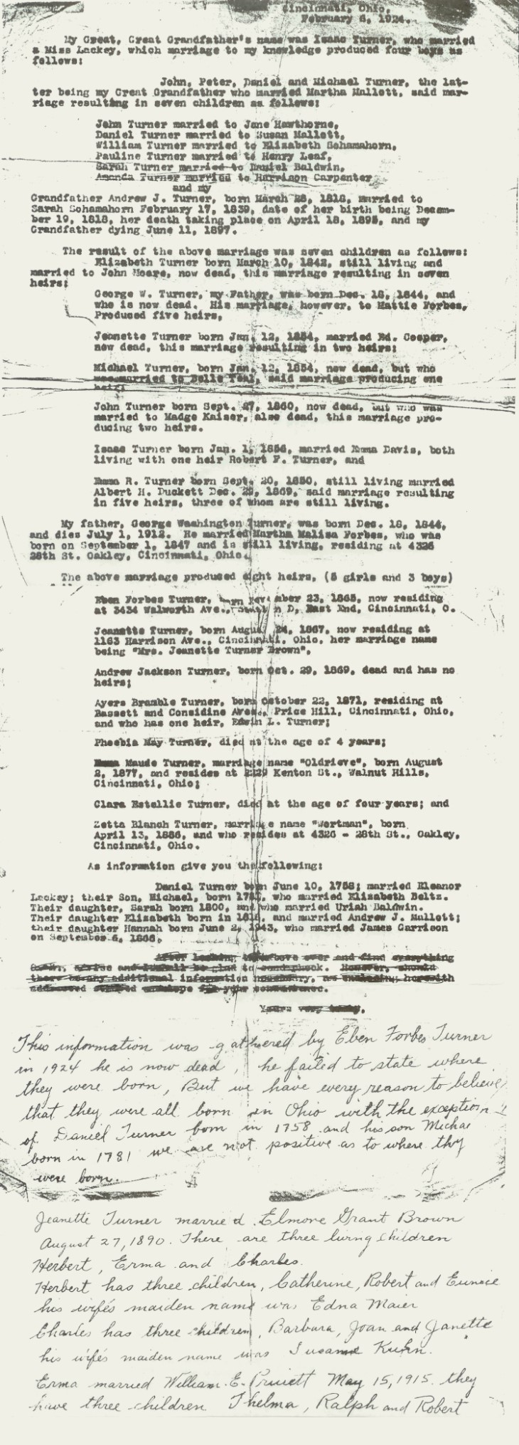 On February 6, 1924, Eben Forbes Turner outlined, from memory, the Turner family history to William Ellis Pruiett who prepared a brief document reflecting what his uncle told him. Most of Eben Turner's recollections have been confirmed. However, there are a few inconsistencies in his account. The first paragraph says his great-great grandfather, Isaac Turner, married a Miss Lackey and they had four sons, John, Peter, Daniel and Michael and that Michael, his great grandfather, married Martha Mallott. However, the last paragraph says that Daniel Turner born June 10, 1758, married Eleanor Lackey and that their son, Michael, born in 1781, married Elizabeth Beltz. The New York Genealogical and Biographical Record, Vol. 061, No. 3, July 1930, Grevenraedt Family, p. 235, indicates that Daniel Tourneur (born June 10, 1758), son of Peter Tourneur and Elizabeth Grevenraedt, married Eleanor Lackey. Loudoun County, Virginia records confirm that Michael Turner (who was born around 1781) and Elizabeth Beltz, the daughter of Andrew Beltz, were married on October 29, 1799. Thus, the last paragraph of Eben Turner's recollections would seem to have superceded his first paragraph regarding the marriage of Michael Turner, and the children listed in the second paragraph were from his marriage to Elizabeth Beltz.