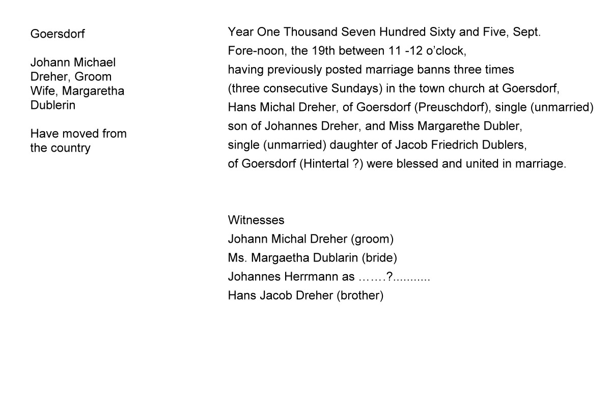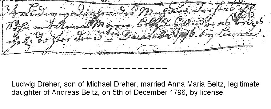 - One last clue in the Alsatian records is a marriage record dated May 18, 1767 in which Matthias Cuntz married Catharina Barbara Dobler, the daughter of Jacob Friedrich Dobler. Eva Margaretha Dubler's father was Jacob Friedrich Dubler. Thus, it appears that Hans Michael Dreher and Mathias Cuntz (Coontz) married sisters. Since the families knew each other in Alsace, it would appear that they took the same ship to America just a few months after the birth of the Dreher's daughter and the Cuntz's marriage. Adding these records to the Washington County probate record confirms that the families had a longstanding relationship.