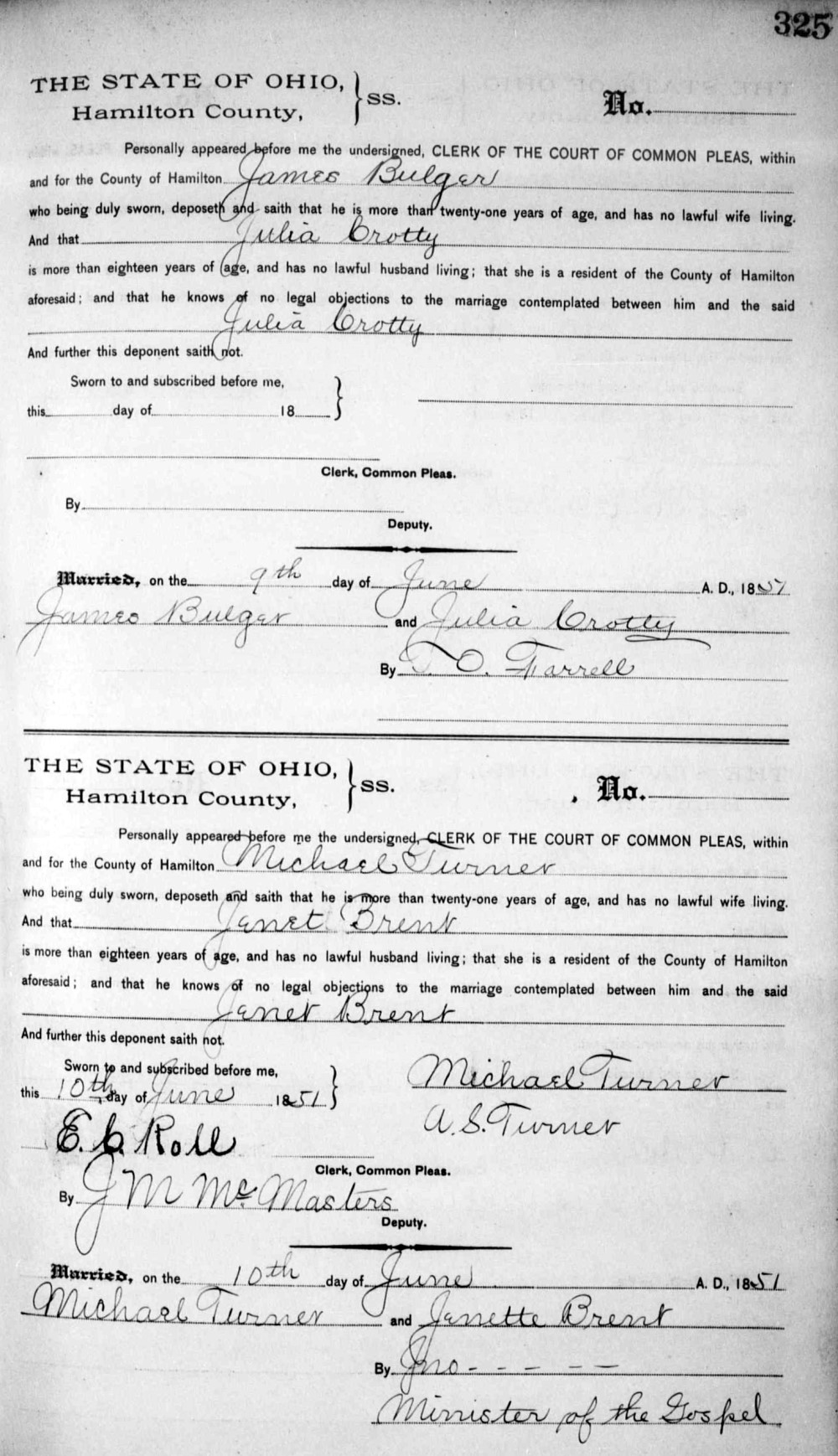 - Michael Turner, Jr., b. ~1781, m1. Elizabeth Beltz on Oct. 29, 1799 in Loudoun Co., Va., m2. Nancy LNU ~1826 in Clermont Co., Ohio, m3. Jenette Brent on June 10, 1851 in Hamilton Co., Ohio (see marriage record), d. Jan. 16, 1856 in Clermont Co., Ohio.