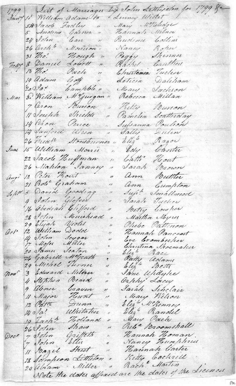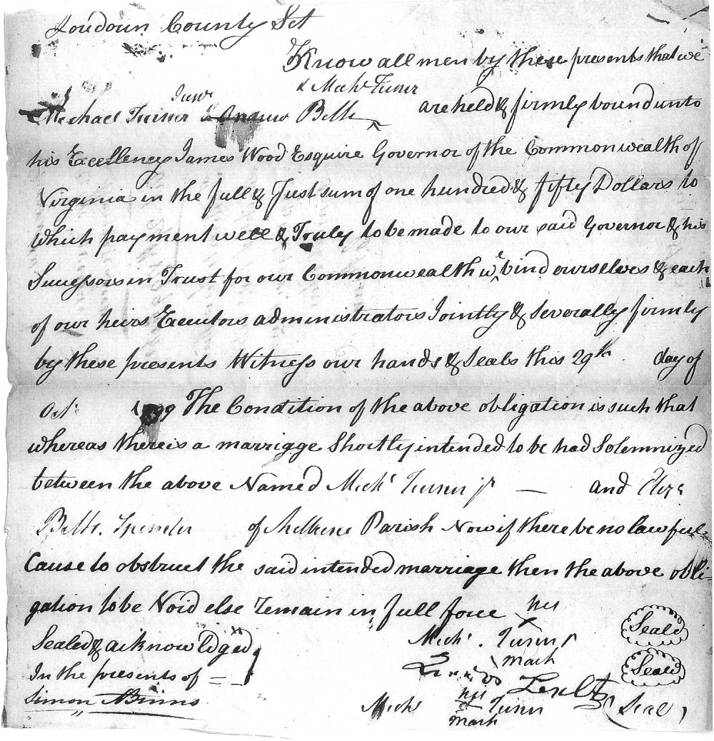 While the Turner family was living in Loudoun County, Virginia in the 1790s, Lewis Turner and Michael Turner, Jr. married daughters of Andrew Beltz and Julianna (Harclerode) Beltz. Lewis (Ludwig) Turner/Dreher married Anna Maria Beltz on Dec. 5, 1796 at the New Jerusalem Lutheran Church in Lovettsville, Va. Here is a copy of the entry in the church record in the original German as was the practice in that church. Immediately below the image of the church record is a rough English translation. Anna Maria Beltz had been born on March 20, 1770 in Lancaster County, Pennsylvania. Almost three years later, on October 29, 1799, Michael Turner and Elizabeth Beltz obtained a marriage license in Loudoun County, Virginia. With that license, Michael Turner, Jr., Andrew Beltz and Michael Turner, Sr. bound themselves to pay the marriage bond of $150. At the bottom of the marriage license, both Turners made their mark while Andrew Beltz signed his name. John Littlejohn, a Methodist minister, performed the wedding ceremony. Given the distance between Lovettsville and Leesburg, around 30 miles, it is likely that the marriage took place on the same day the license was issued. Why did Michael Turner, Jr. and Elizabeth Beltz get married in a civil ceremony while Lewis Turner and Anna Maria Beltz had previously gotten married in the church? The answer may lie in the fact that Michael's and Elizabeth's first child was born around four months after their wedding. This impending birth may have necessitated their obtaining a marriage license which allowed for an immediate wedding as opposed to using the "marriage by banns" procedure which required an extended waiting period before the marriage could take place. Since the marriage of Lewis Turner and Anna Maria Beltz was not officially recorded in Loudoun County, it is likely they used the "marriage by banns" procedure which called for a public notice of an intended marriage to be given verbally or by written notice for three consecutive meetings at the church(es) of the bride and groom or at other public gatherings. Under these circumstances, it is understandable that the Turner and Beltz families would want to have a quick civil ceremony in Leesburg for Michael and Elizabeth rather than a publically announced event in Lovettsville.