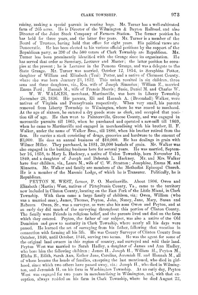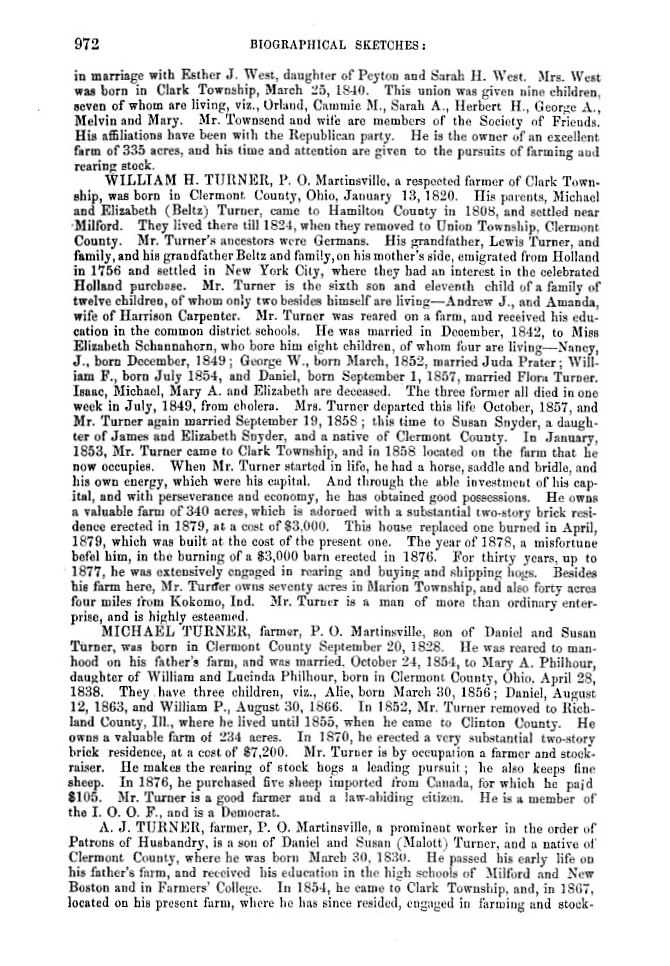 There is one additional piece of evidence to support the scenario that our ancestors were duped, and perhaps swindled, into believing they were descended from Daniel Tourneur of New York. It comes to us from a brief biographical sketch of William H. Turner, son of Michael Turner, Jr. and Elizabeth Beltz, which was included in a History of Clinton County, Ohio, published in 1882 by W.H. Beers and Company. The sketch indicated that William H. Turner's ancestors were German and that his grandfather Lewis Turner and family and grandfather Beltz and family "emigrated from Holland in 1756 and settled in New York City where they had an interest in the celebrated Holland purchase." Besides giving us a third grandfather for the children of Michael Turner, Jr., Lewis Turner (which contradicts Eben Turner's account that this grandfather was Isaac Turner who married a Miss Lackey or Daniel Turner who married Eleanor Lackey), the sketch ties the Turners to the Holland Purchase. This was probably meant to be a reference to the Manhattan Island farm of the Jans family who emigrated from Holland and not the Holland Purchase which was located in western New York and took place in the 1790s when the Turners were living in Loudoun County, Virginia. We have found no evidence that the Turners were associated with the Holland Purchase, the Holland Land Company or any of its associated Dutch bankers. What this sketch does provide, however, is another clue that the Turners were German and emigrated to the Americas in the mid-1700s.