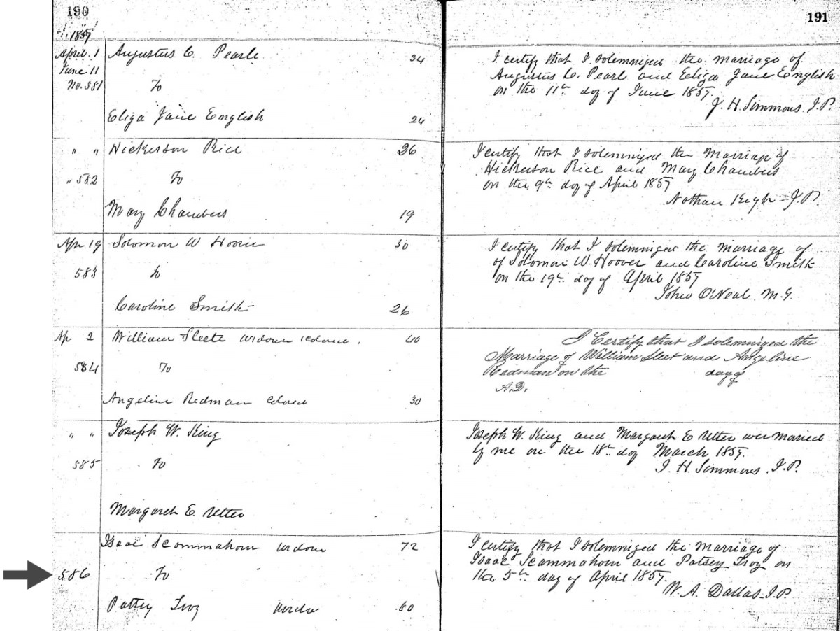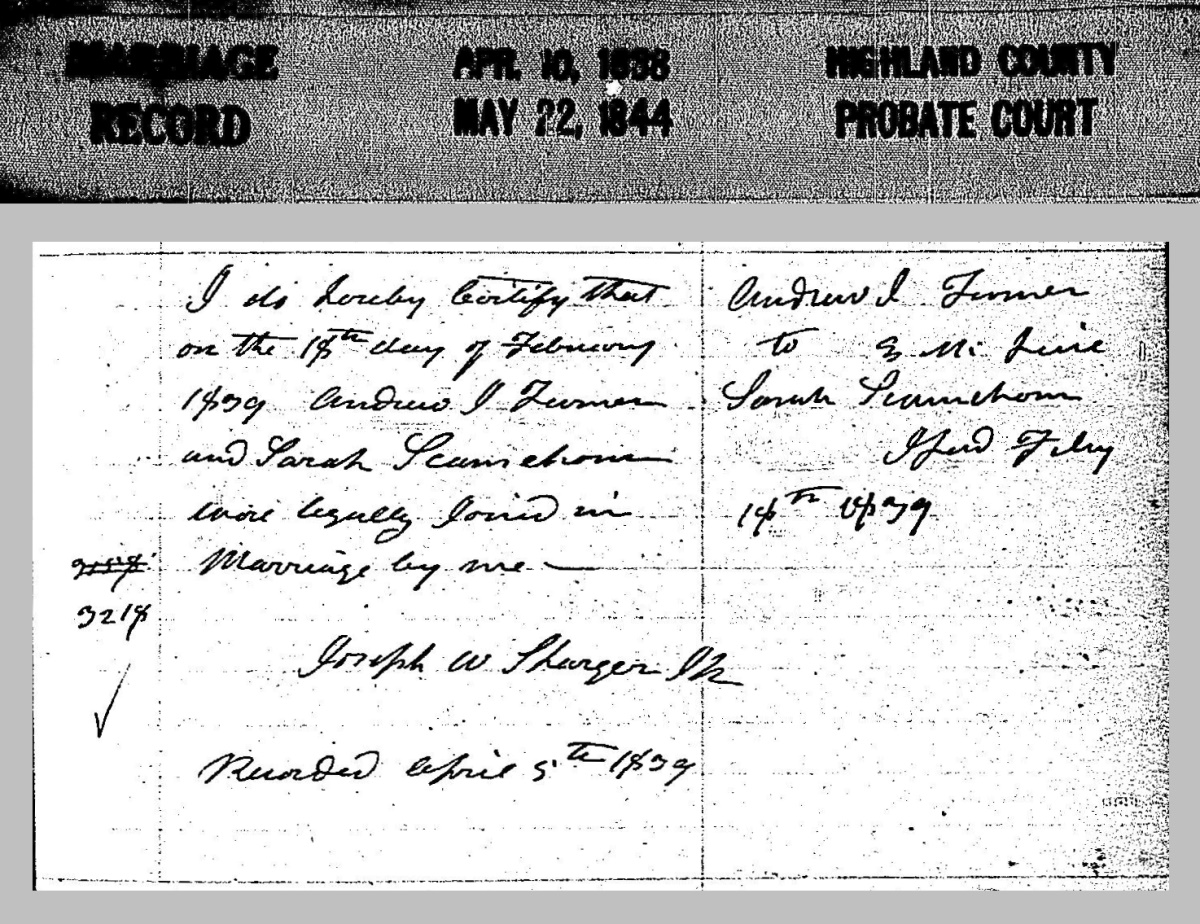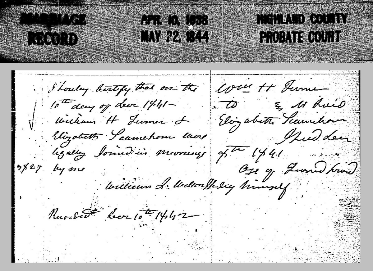 - Isaac Scammahorn, b. ~1785 in Washington Co., Penn., m. April 5, 1857 in Highland Co., Ohio (see marriage record), d. Dec. 21, 1858 in Highland Co., Ohio. Isaac Scammahorn was the father of Sarah and Elizabeth Scammahorn who married Andrew J. Turner and William H. Turner, sons of Michael Turner, Jr. and Elizabeth Beltz.