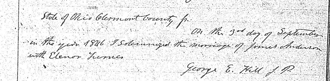 - Eleanor Turner, b. Feb. 15, 1825, m. James Anderson on Sept. 3, 1846 in Clermont Co., Ohio (see marriage record), d. March 26, 1873 in Clermont Co., Ohio. According to the 1850 Mortality Schedule, James Anderson died of consumption in June 1850.