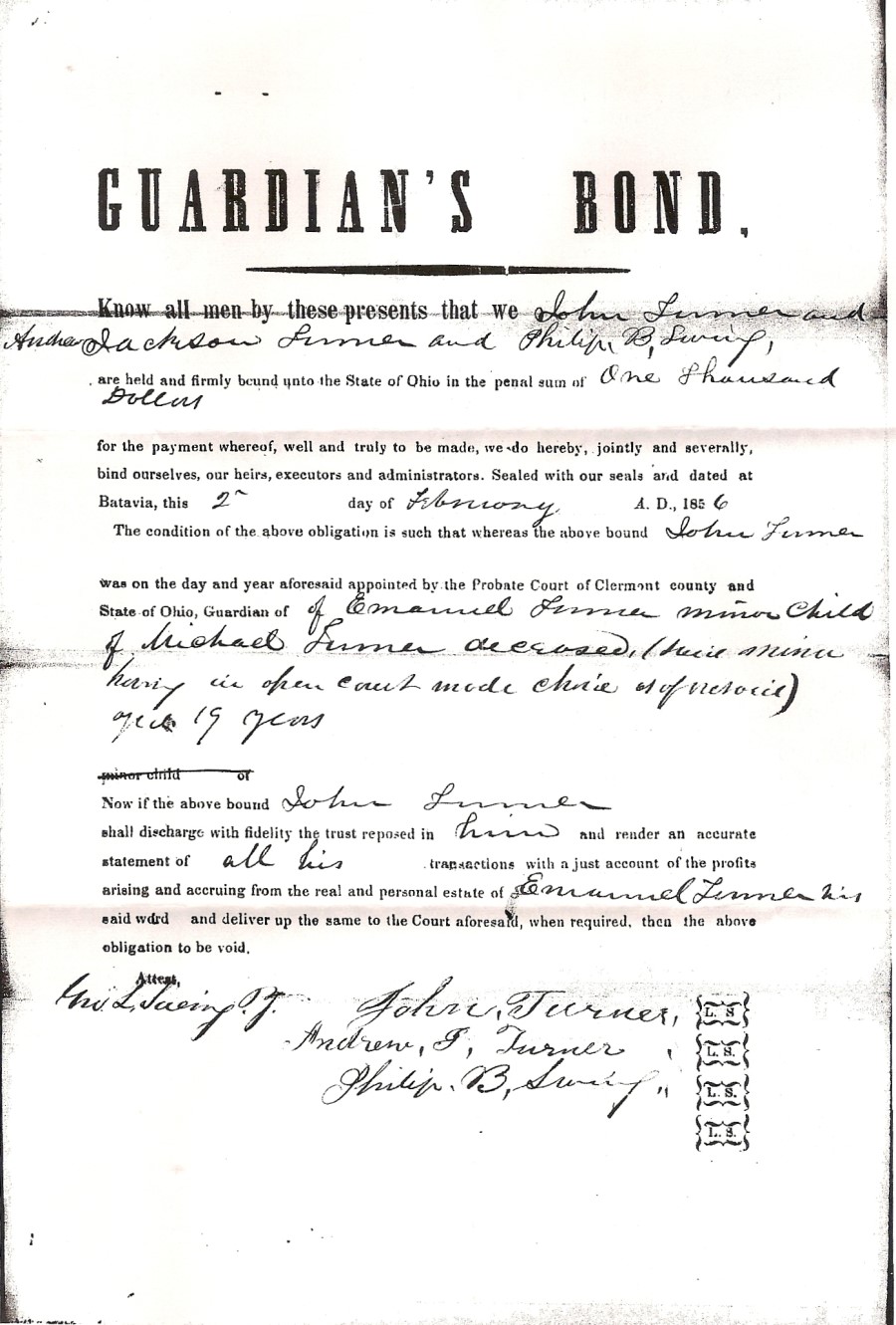 One avenue for determining the parents of some of the children would be to look at death certificates that name the father and mother of the deceased. Fortunately, we have a few of those. Amanda Carpenter's death record in Brown Co., Ohio (see link on previous page) indicates her father was Michael Turner, but her mother was unknown. Amanda Carpenter has generally been listed as the last child of Michael and Elizabeth Turner, but it's possible she was born to Nancy LNU before her marriage to Michael Turner. Harriet (Turner) Dalton, Nancy Jane (Turner) (Adams) Marriott, and Emanuel Turner lived for many years in Chicago and all three died there. Harriet Dalton's 1912 Cook Co., Ill. death certificate (see link above) lists her parents as E. Turner and Nancy Turner, both born in Ohio. Nancy Jane Marriott's death certificate also listed her father as E. Turner, this time born in Germany, and mother unknown. Emanuel Turner's death certificate does not provide a name for his father, born in Germany, or his mother, born in England. Thus, two of these latter three death certificates indicate that the father's name was E. Turner (either born in Germany or Ohio) and one indicates the mother's name was Nancy (born in Ohio). Shortly after the death of Michael Turner, Jr., a Guardian's Bond was presented in the Probate Court in Clermont Co., Ohio, for Emanuel Turner indicating that he was a "minor child of Michael Turner deceased." This should mean that Emanuel Turner was a natural child of Michael Turner, but it probably doesn't rule out the possibility that he was his adopted son. All of these documents give us clues, but no definitive answers, as to the parentage of the children living with Michael Turner after 1840.