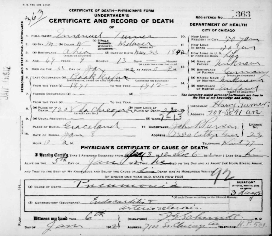 - Emanuel Turner, b. ~1837, m. Amelia M. Moore after 1860, d. Jan. 5, 1912 in Chicago, Ill. (see Emanuel Turner's death certificate).