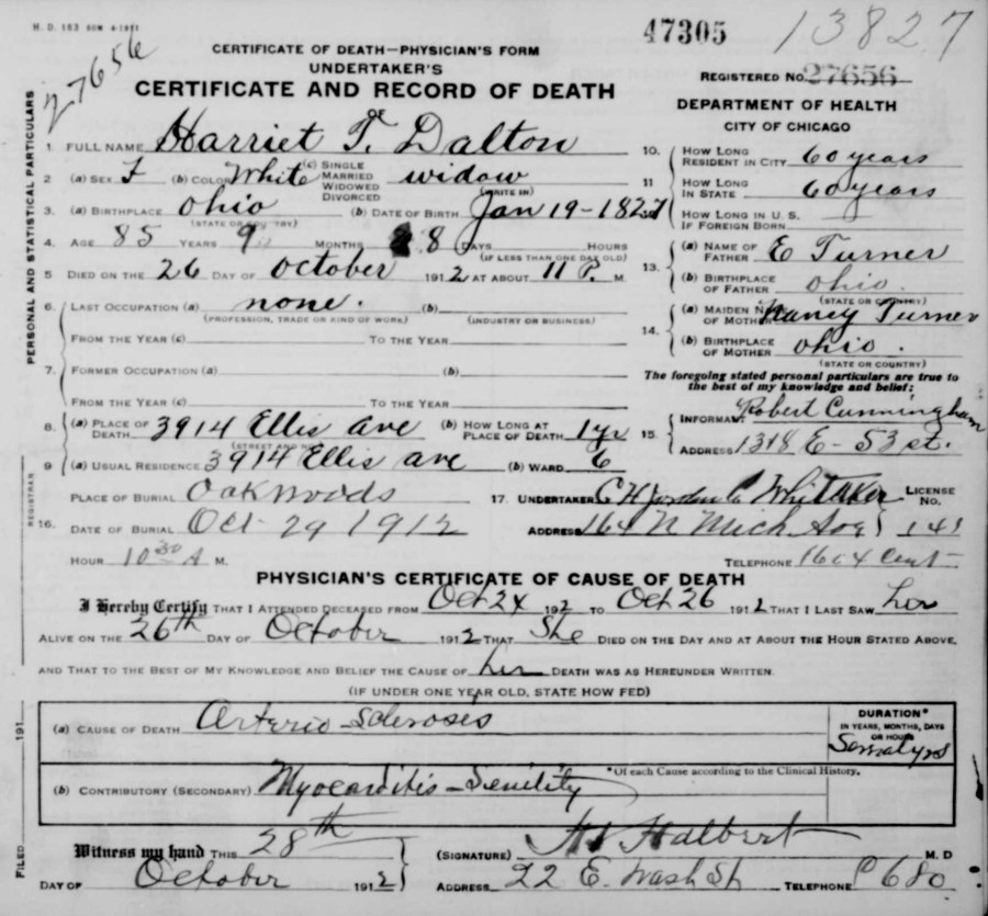 - Harriet Turner, b. Jan. 19, 1827, m. James P. Dalton on Dec. 26, 1854 in Hamilton Co., Ohio, d. Oct. 26, 1912 in Chicago, Ill. (see Harriet Dalton's death certificate).