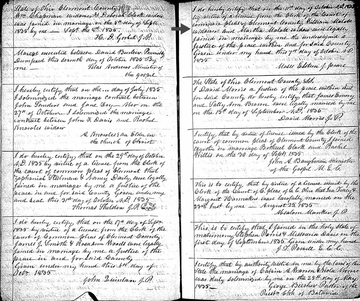 - Peter Malott, b. Nov. 20, 1786 in Washington Co., Md., m. Jan. 5, 1809, d. Jan. 20, 1826 in Clermont Co., Ohio.