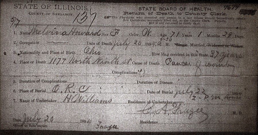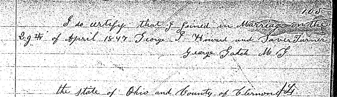 - Melvina Turner, b. ~1825 according to the 1850 census or May 21, 1823 according to her death certificate, m. George L. Howard on April 29, 1847 in Clermont Co., Ohio (see marriage record), d. July 20, 1894 in Springfield, Sangamon Co., Ill.