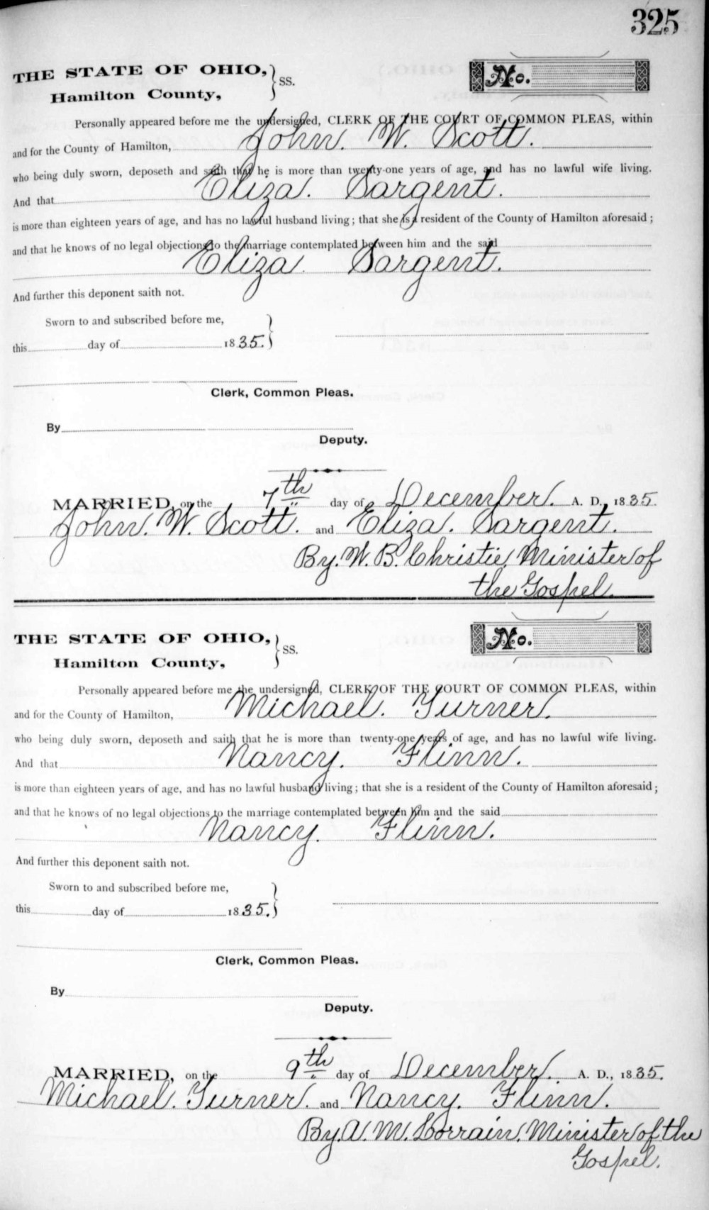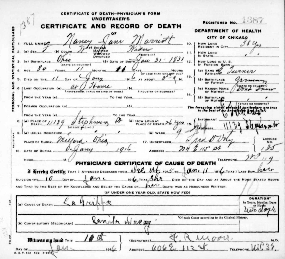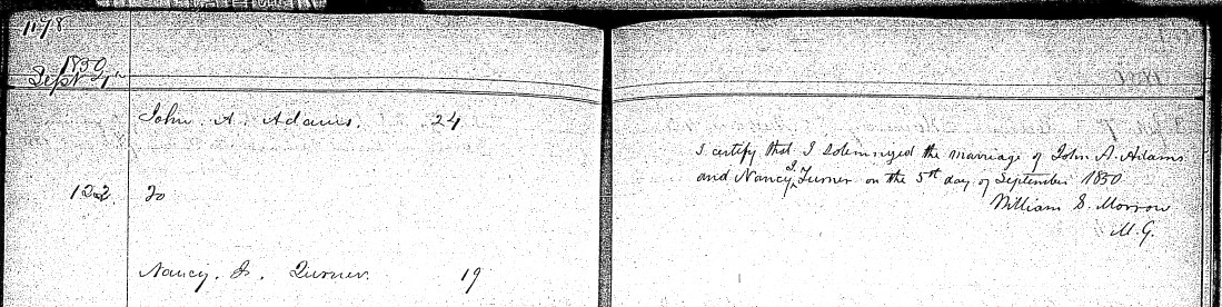 - Nancy Jane Turner, b. 1832, m1. John A. Adams on Sept. 5, 1850 in Clermont Co., Ohio (see marriage record), m2. Newton W. Marriott on Oct. 1, 1867 in Clermont Co., Ohio, d. Jan. 11, 1916 in Chicago, Ill. (see Nancy Jane Marriott's death certificate).