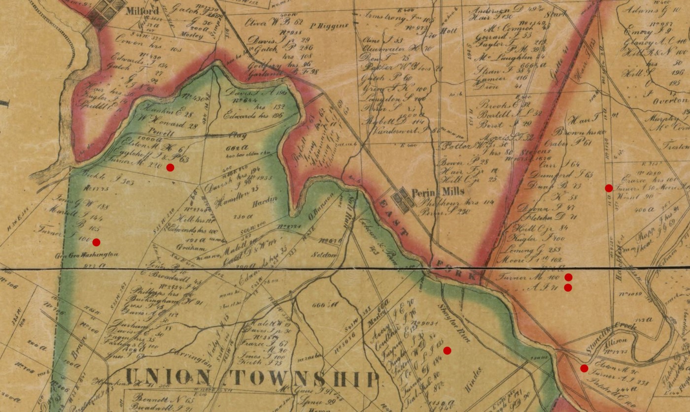 By 1850, the Turners had many significant parcels of land in Clermont County including Michael Turner, Jr.'s 220 acres in Union Township (originally purchased in 1817) just south of the East Fork of the Little Miami River and another 100 acres north of the East Fork in Stonelick Township; Daniel Turner's 184 acres in Union Township; Andrew Jackson Turner's three parcels in Stonelick Township of 238 acres, 71 acres and 50 acres; and finally, 100 acres in Union Township just south of Michael Turner's 220 acre parcel that belonged to either Andrew Jackson Turner or John Turner. See the map linked to the image to the right to see where each of these properties was located (red dots mark the names of the Turners who owned the property; precise locations are not identified). It's said that Daniel Turner had another 200 acres in Miami Township, just east of Perins Mills (Perintown); however, this parcel does not appear on this 1850 map.