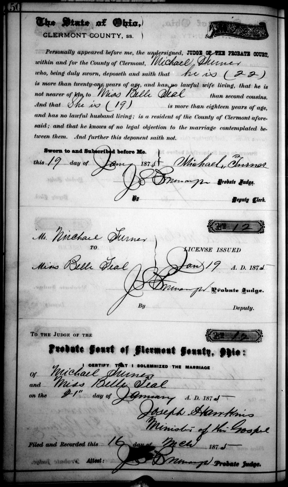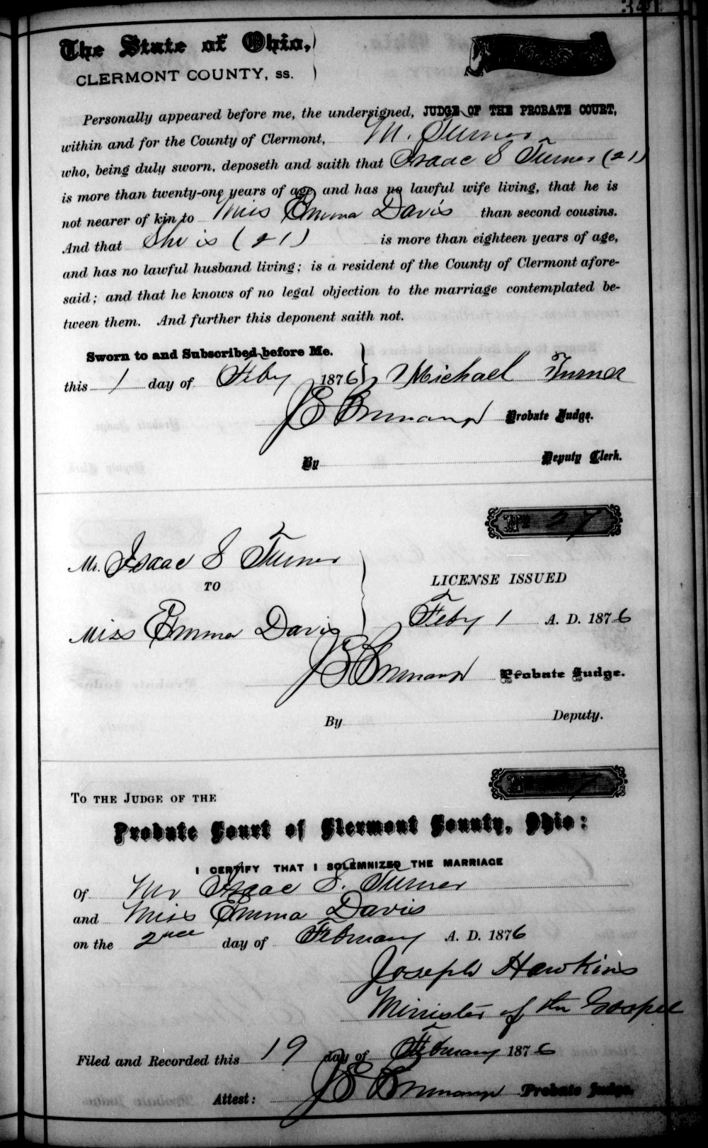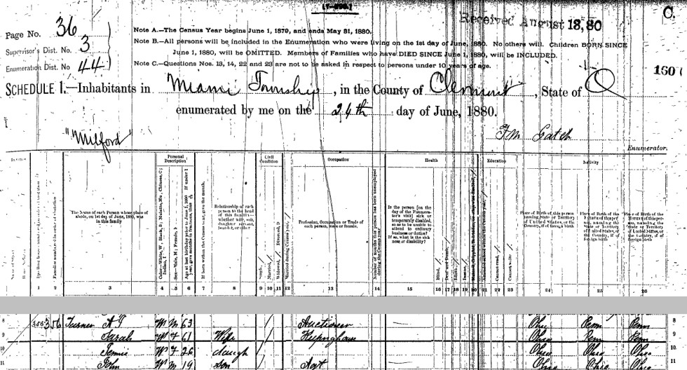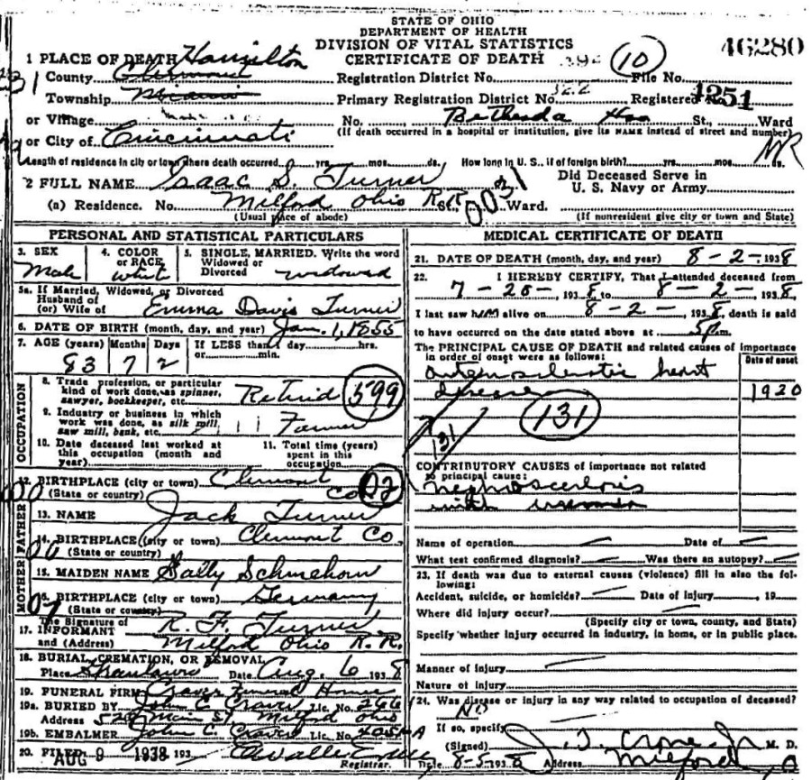 - Isaac S. Turner, b. Jan. 1, 1855, m. Emma Davis on Feb. 2, 1876 in Clermont Co., Ohio (see marriage record), d. Aug. 2, 1938 (see Isaac Turner's death certificate).