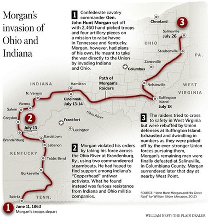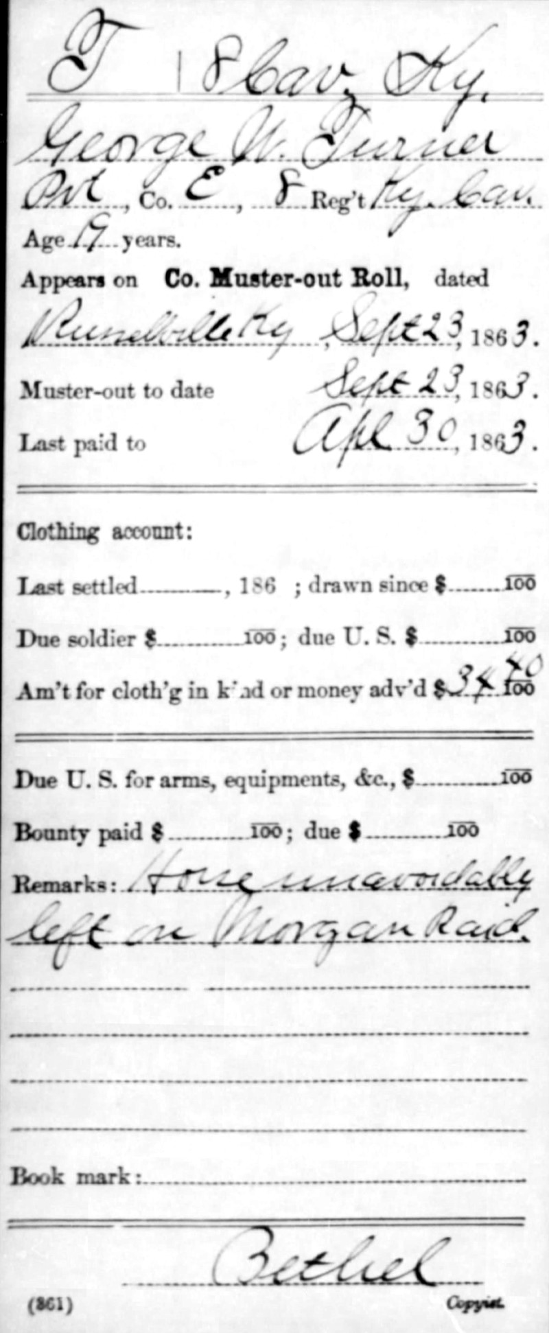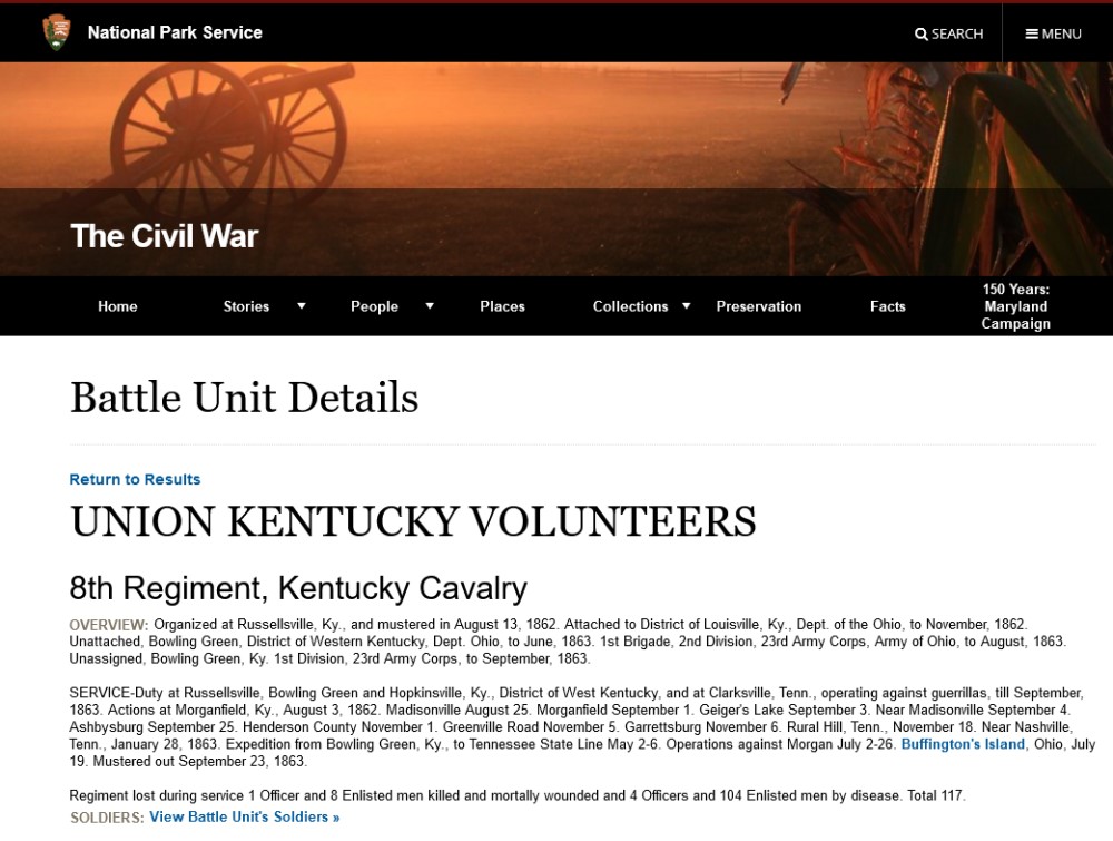 Andrew Jackson Turner's son, George Washington Turner, enlisted in the Union Army, 8th Regiment, Kentucky Cavalry, Company E, on August 13, 1862 in Newport, Ky. The 8th Regiment began recruitment in August 1862 and was at full strength by Sept. 13, 1862. The term of enlistment was one year. The regiment mostly operated in Kentucky and Tennessee, but according to a regimental history, they participated in operations against Morgan's Raiders from July 2-26, 1863. John Hunt Morgan had led a daring raid into Indiana and Ohio in June and July 1863 before he and his remaining men were captured in northeast Ohio on July 26, 1863. We do not know the full extent of the 8th Regiment's role in the pursuit of Morgan, but after his capture, the regiment returned to Russellville, Ky. and, having fulfilled its one year of service, was mustered out on Sept. 23, 1863. On the muster-out roll for George W. Turner, a remark was entered, "Horse unavoidably left on Morgan Raid." We're not entirely sure what this meant, but could be an indication that the chase took its toll on his horse. This 1890 census Special Schedule provides a few more details including the fact that he suffered a back injury during his service. This injury may provide another reason why his "horse (was) unavoidably left on (the) Morgan Raid."