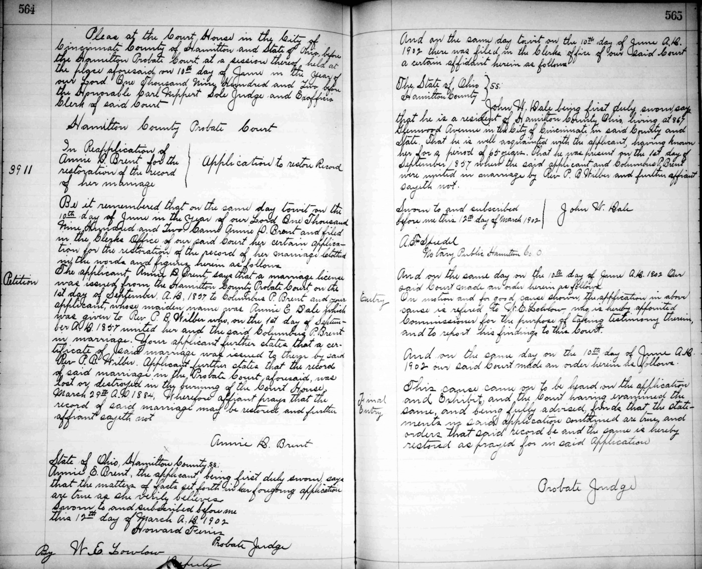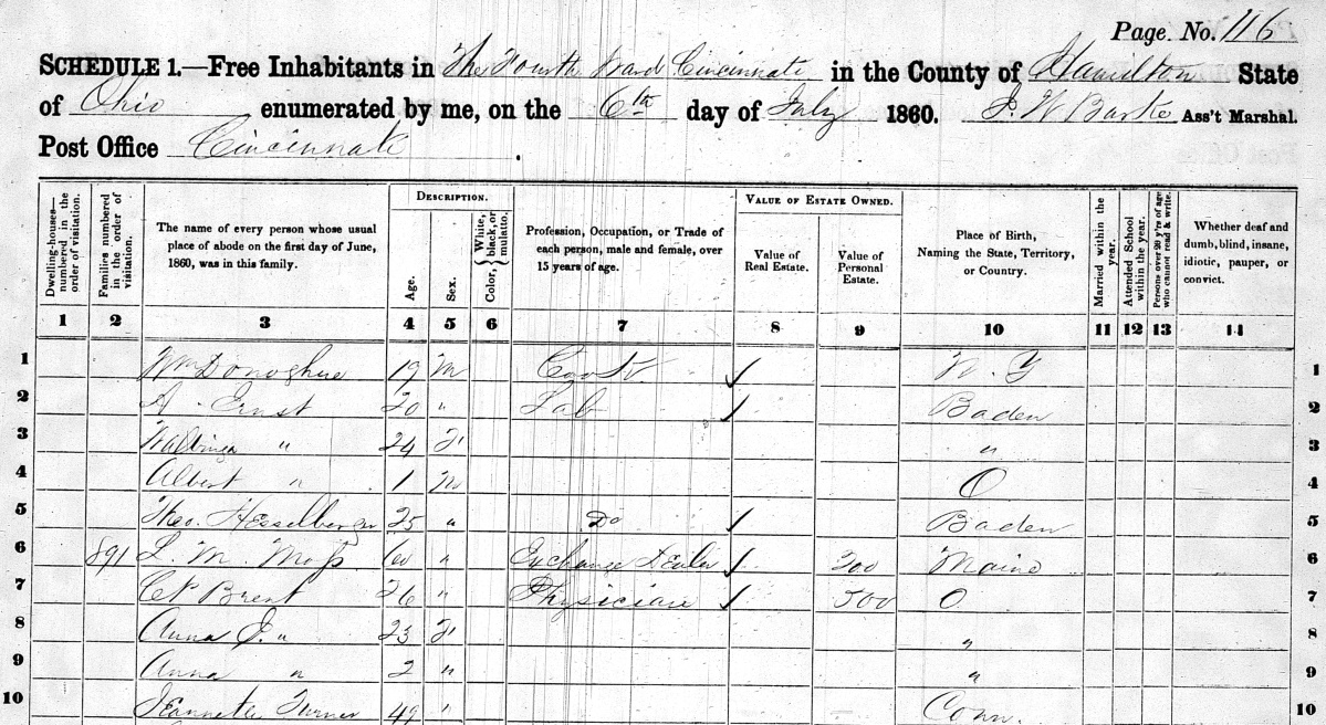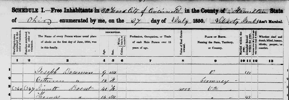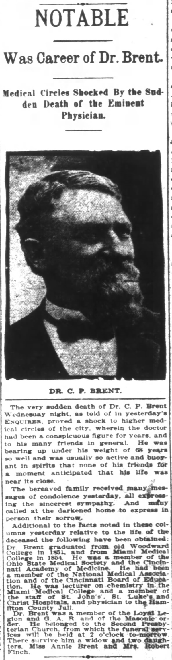 Michael Turner, Jr.'s wife Nancy must have died before 1850 since she is not listed in that year's census. Michael Turner, Jr. married Jenette Brent on June 10, 1851. This was the third marriage for Michael Turner, Jr. and the second for Jeanette Brent. Jinnett Brent, age 41, was listed in the 1850 census in Hamilton Co., Ohio as the single mother of Thomas Brent, age 16. According to the 1860 census, after Michael Turner, Jr. had died, Jeanette Turner lived in Hamilton County in a household with a 26-year old named C.P. Brent and his wife, Anna. We believe C.P. Brent, a physician by that time, was her son who was erroneously listed as Thomas instead of Columbus in the 1850 census. Columbus P. Brent and Annie E. Dale were married on Sept. 1, 1857 in Hamilton Co., Ohio (see this 1902 Application to Restore Record). At the time of his mother's marriage to Michael Turner, Jr. and for several years after, C.P. Brent was attending Woodward College where he graduated in 1851 and Miami Medical College from which he graduated in 1854. C.P. Brent went on to have an illustrious career in medicine. During the Civil War he served in the 54th Ohio Infantry with stints as brigade surgeon in William Tecumseh Sherman's army and several commands at hospitals. Columbus P. Brent, age 67, died in 1901. Here's an obituary in the Cincinnati Enquirer. His Hamilton Co., Ohio death record lists his mother as Jeanette Brent and his father as William Brent.