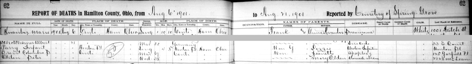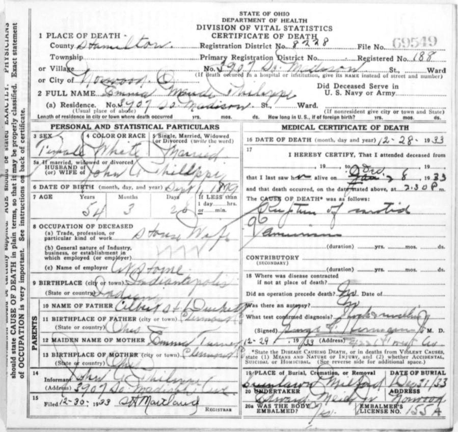 - Emma R. Turner, b. Sept. 20, 1850, m. Albert H. Duckett (see daughter Emma Maude's death certificate) on Dec. 29, 1869 in Clermont Co., Ohio (see marriage record), d. after 1924. The Ducketts moved to Indianapolis in the early 1870s, but returned to Hamilton Co., Ohio by 1910.