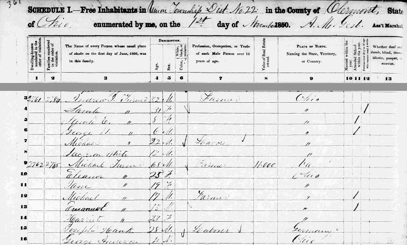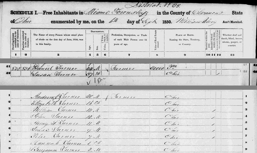 By 1880, the Andrew J. Turner household was down to four members. An important clue to finding earlier records of the Turner family may be the fact that Andrew indicated that his father, Michael Turner, Jr. was born in Pennsylvania. If true, Michael Turner, Sr. must have lived in Pennsylvania around 1781 when Michael, Jr. was born, moved to Loudoun Co., Va. by 1790, and then moved back to Pennsylvania around 1800. Of course, another possibility is that Andrew J. Turner was mistaken and only knew that his father had moved to Ohio from Pennsylvania and assumed that was where he was born.
