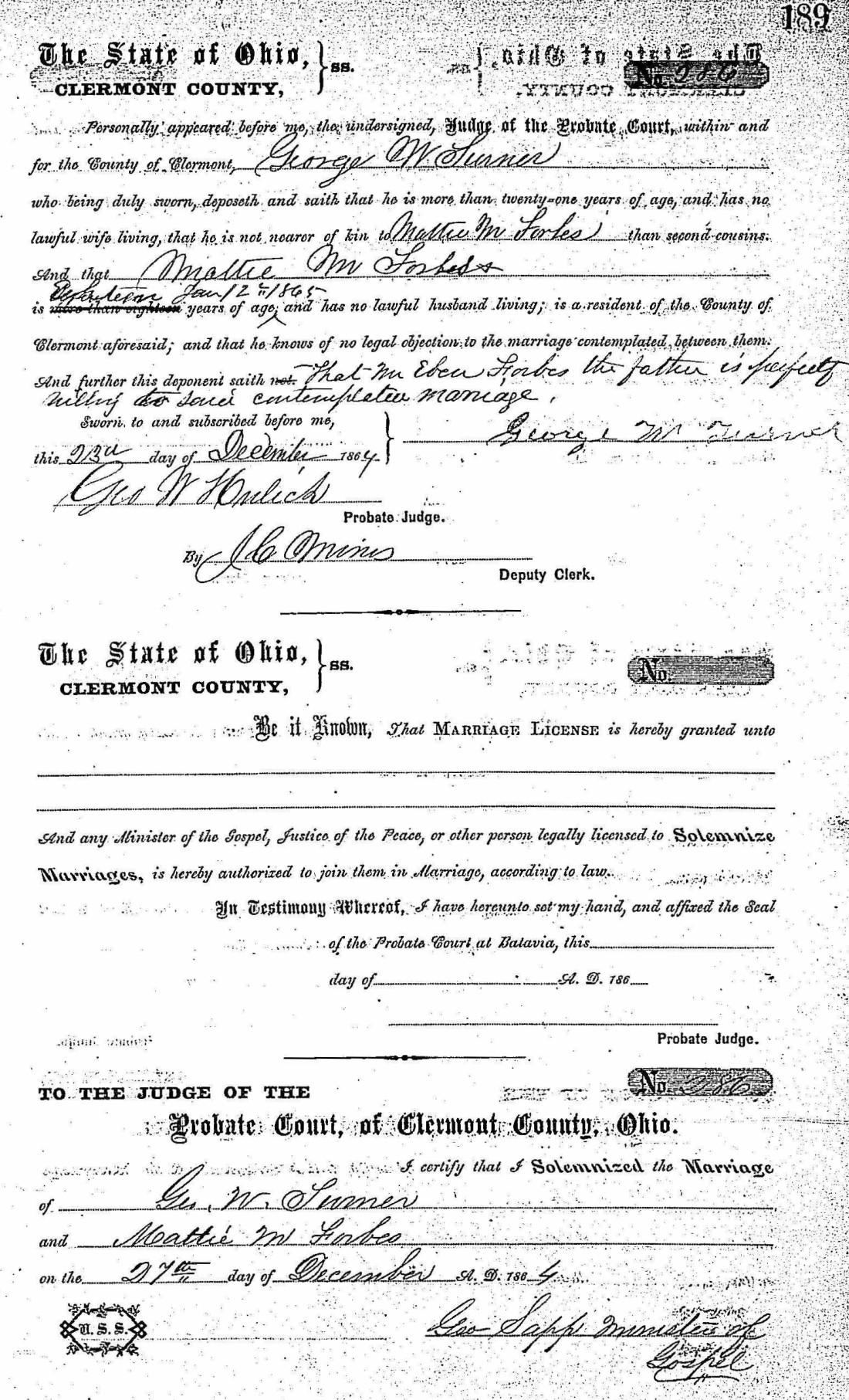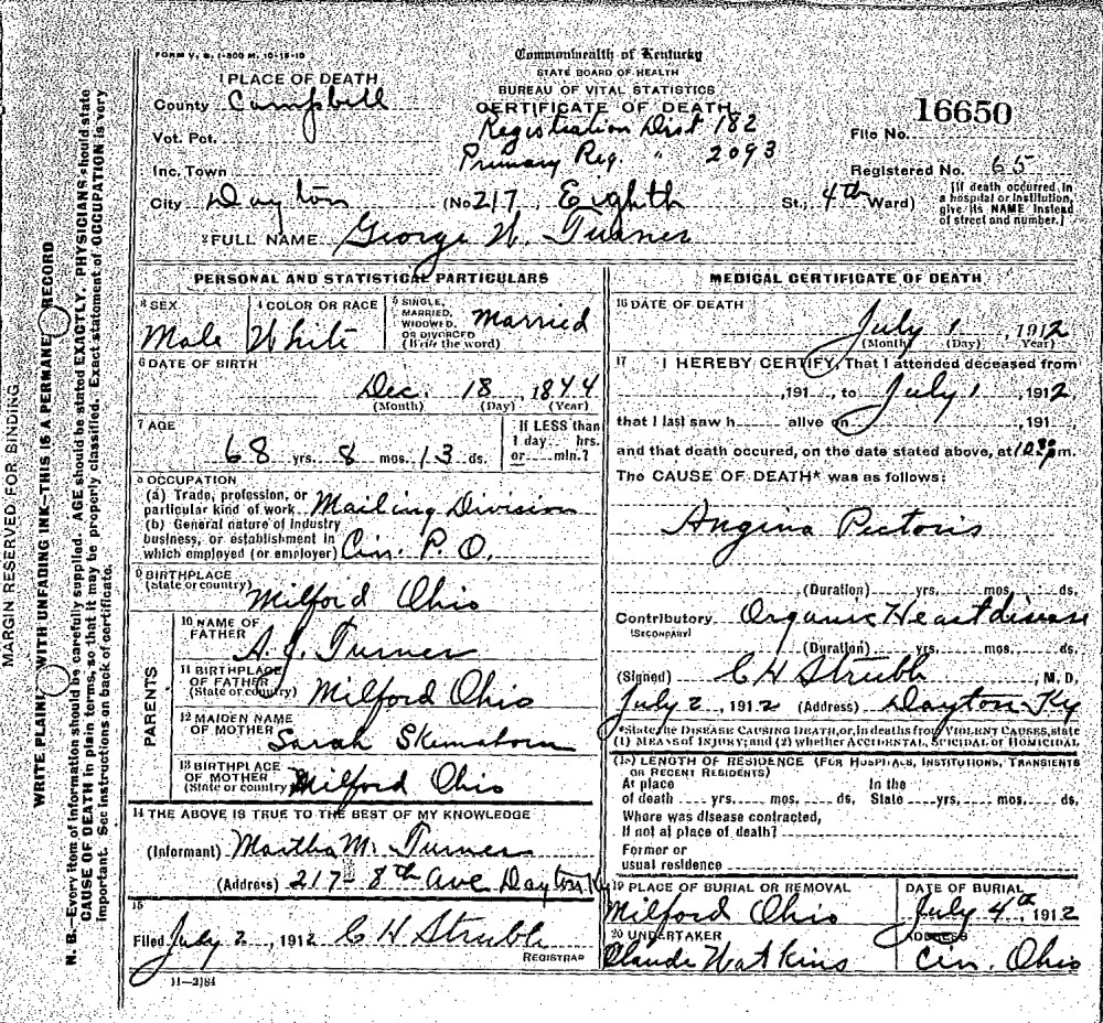- George Washington Turner, b. Dec. 18, 1844 in Clermont Co., Ohio, m. Martha Melissa Forbes on Dec. 27, 1864 (see marriage record), d. July 1, 1912 in Dayton, Campbell Co., Ky. (see death certificate)