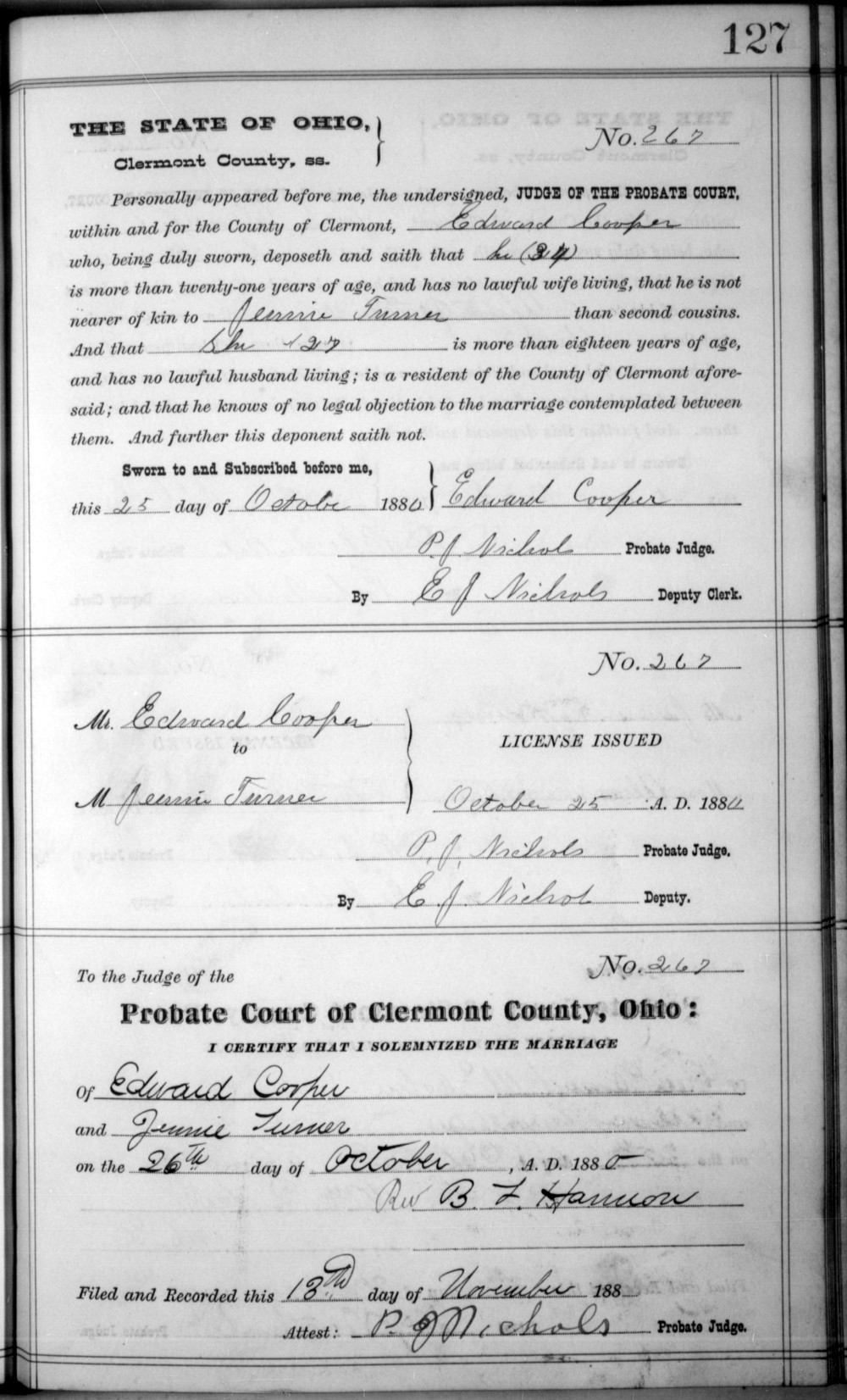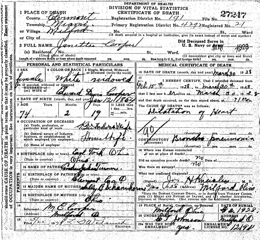 - Jenette Turner, b. Jan. 12, 1854 in Clermont Co., Ohio, m. Edward Davis Cooper on Oct. 26, 1880 in Clermont Co., Ohio (see marriage record), d. March 30, 1928 (see Jenette/Janette Cooper's death certificate).