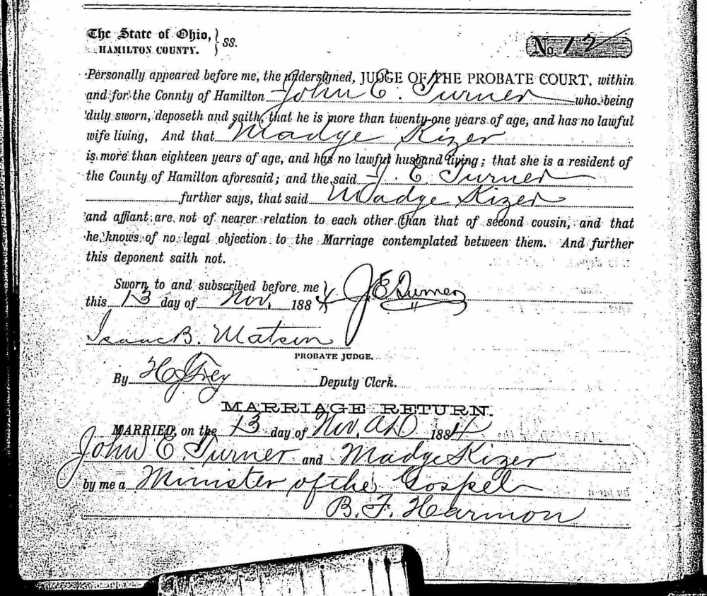- John E. Turner, b. Sept. 27, 1860, m. Madge Kizer on Nov. 13, 1884 in Hamilton Co., Ohio (see marriage record), d. before 1924.