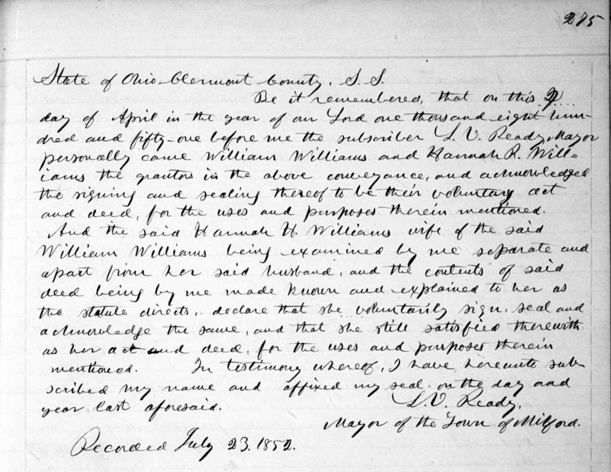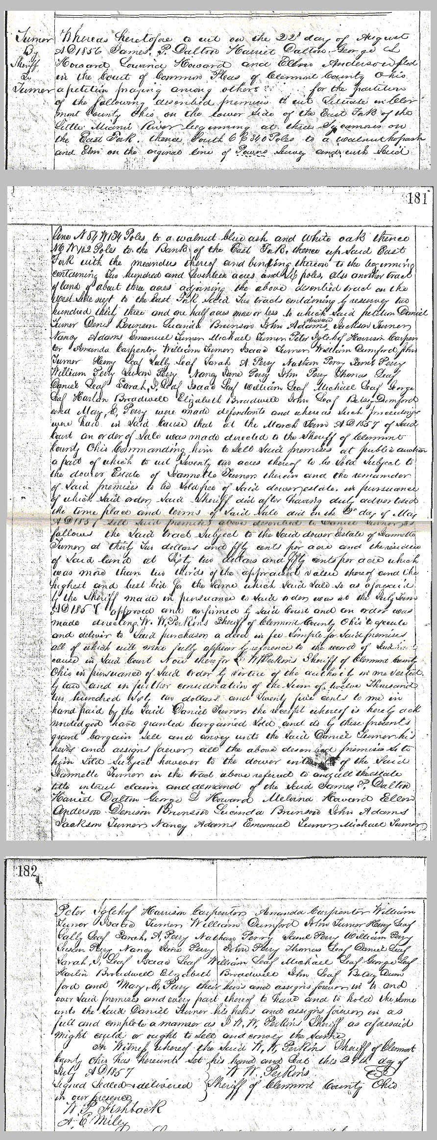 According to the 1850 census, Andrew Jackson Turner and his father Michael lived near each other in Union Twp., Clermont Co., Ohio. This likley means Andrew Jackson Turner was living in a house on his father's property since none of his holdings were contiguous to his father's property. Daniel Turner, Andrew Jackson Turner's older brother, lived on his property in Miami Twp., Clermont Co., Ohio. This is likely the property north of the East Fork of the Little Miami River, just east of Perins Mills (Perintown), that doesn't appear on the map on the previous page. This property was said to be a short distance across the East Fork from his Union Township property.
