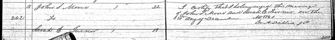 - Sarah Elizabeth Turner, b. Mar. 10, 1842, m. John S. Moore on Dec. 20, 1860 in Clermont Co., Ohio (see marriage record), d. after 1924.